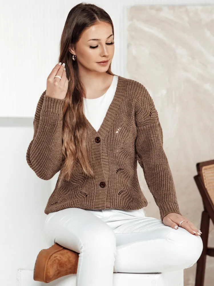 Rozpinany sweter damski z delikatnymi ażurowymi detalami to idealny wybór na chłodniejsze dni. Wykonany z miękkiej dzianiny zapewnia wygodę i styl. Klasyczne guziki dodają mu elegancji, a uniwersalny fason sprawia, że świetnie komponuje się zarówno z codziennymi, jak i bardziej formalnymi stylizacjami.