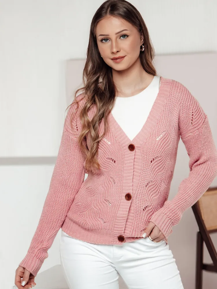 Rozpinany sweter damski z delikatnymi ażurowymi detalami to idealny wybór na chłodniejsze dni. Wykonany z miękkiej dzianiny zapewnia wygodę i styl. Klasyczne guziki dodają mu elegancji, a uniwersalny fason sprawia, że świetnie komponuje się zarówno z codziennymi, jak i bardziej formalnymi stylizacjami.