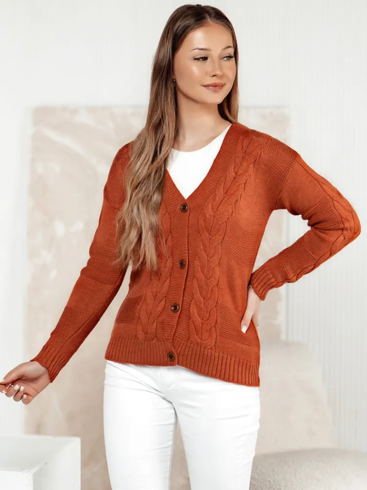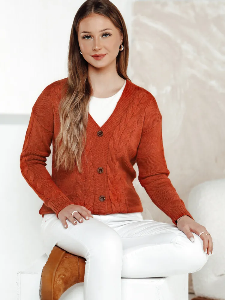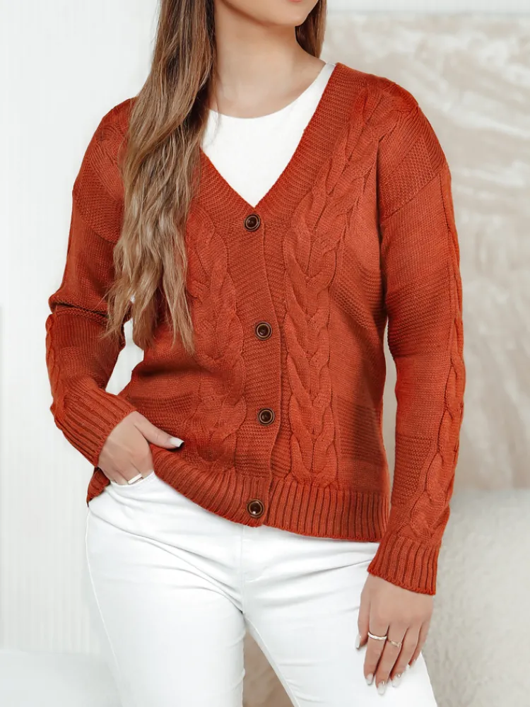 Stylowy sweter z głębokim dekoltem w kształcie litery V, zapinany na guziki. Wykonany z przyjemnego w dotyku materiału z efektownym wzorem warkoczy. Idealny do tworzenia różnorodnych stylizacji – zarówno na co dzień, jak i do pracy. Doskonały wybór dla miłośniczek wygody i ponadczasowej elegancji.