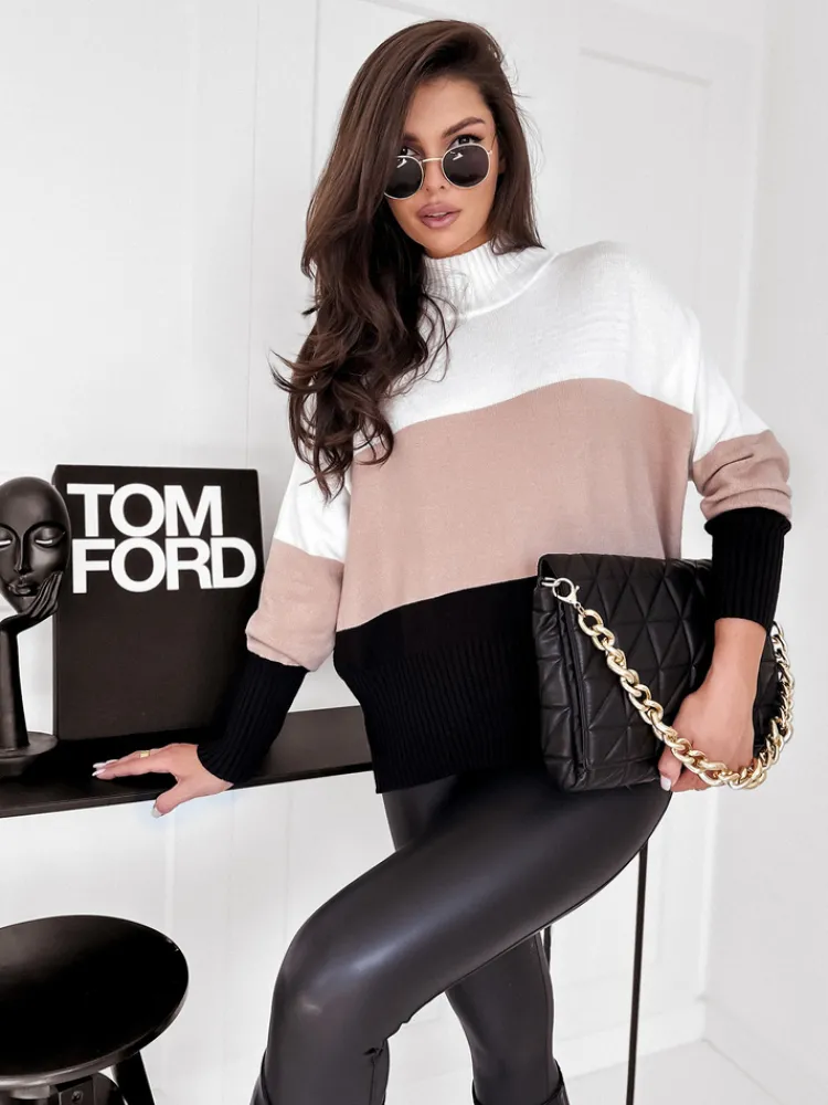 Sweter SERENE typu golf to idealna propozycja na sezon jesienny. Ten sweter wyposażony jest w długi rękaw oraz stylowe ściągacze na dole sweterka, rękawach i golfie, co nie tylko dodaje mu elegancji, ale także zapewnia lepsze dopasowanie do sylwetki. Niezwykłe połączenie kolorystyczne nadaje temu sweterkowi nie tylko piękny, ale i modny wygląd, co pozwala wyróżnić się w jesiennych stylizacjach. Sweter SERENE typu golf to perfekcyjne połączenie komfortu z modą, które sprawi, że będziesz wyglądać stylowo i czuć się wygodnie w każdej sytuacji.