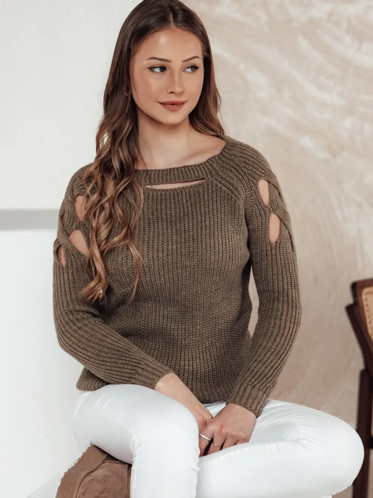 Ten stylowy sweter przyciąga uwagę oryginalnymi wycięciami, które nadają mu wyjątkowego stylu. Wykonany z przyjemnego w dotyku materiału, gwarantuje wygodę przez cały dzień. Idealny wybór na co dzień i na specjalne okazje, które wymagają modnego akcentu.