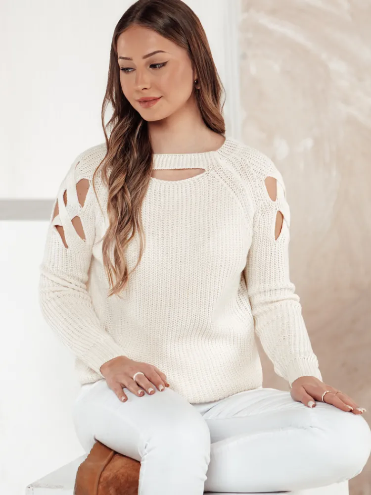 Ten stylowy sweter przyciąga uwagę oryginalnymi wycięciami, które nadają mu wyjątkowego stylu. Wykonany z przyjemnego w dotyku materiału, gwarantuje wygodę przez cały dzień. Idealny wybór na co dzień i na specjalne okazje, które wymagają modnego akcentu.