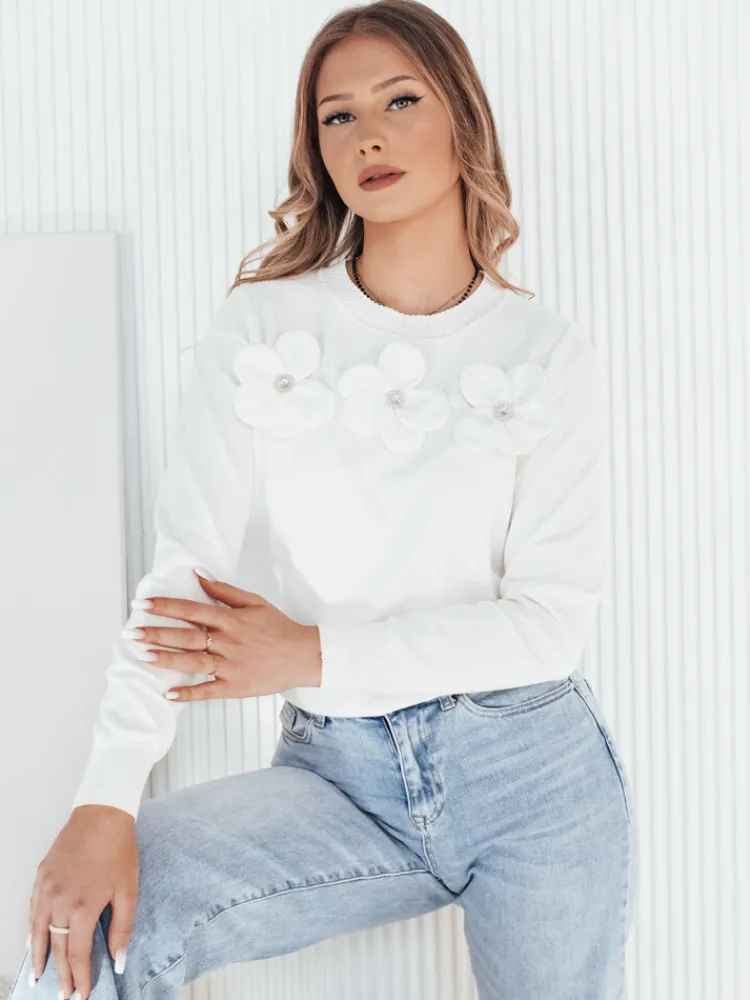 Ożyw swoje codzienne outfity z tym wyjątkowym swetrem. Jego subtelny design wzbogacony naszytymi kwiatkami na piersi sprawia, że jest on zarówno praktyczny, jak i pełen uroku. To świetny wybór dla każdej kobiety, która ceni sobie połączenie komfortu i elegancji.