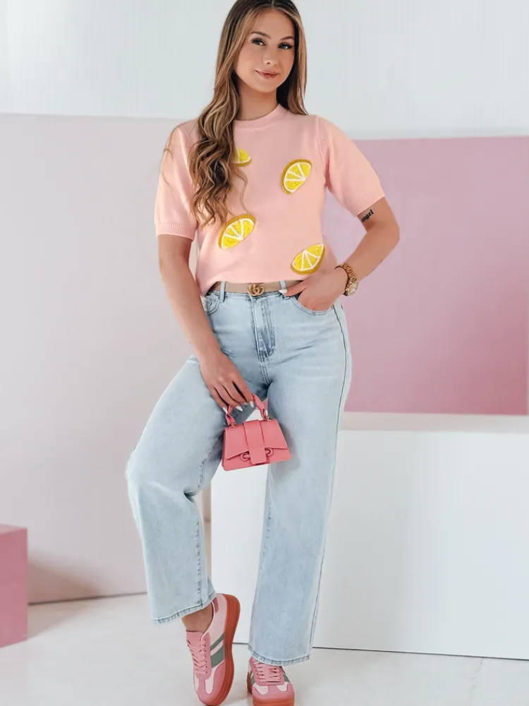 Sweter damski o kroju oversize z krótkim rękawem to idealna propozycja na wiosenne dni. Wykonany z miękkiego, przyjemnego dla skóry materiału, zapewnia komfort noszenia. Model wkładany przez głowę posiada okrągły dekolt oraz ściągacze przy rękawach i dole, które nadają całości schludnego wykończenia. Uniwersalny rozmiar pasuje od XS do L. Ozdobne aplikacje w kształcie cytryn przyciągają wzrok oraz nadają świeżego, radosnego charakteru stylizacjom. Sweter świetnie łączy się z jeansami lub szortami, tworząc stylowy look na cieplejsze dni.