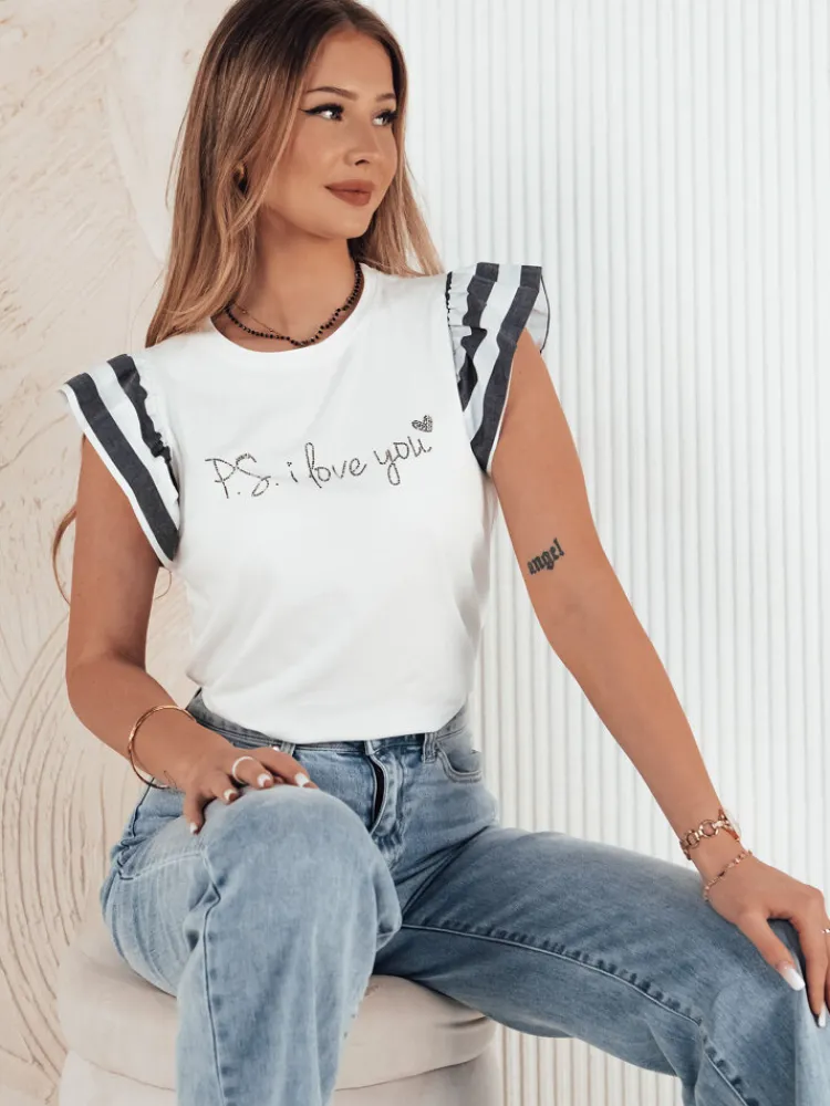 Odkryj urok t-shirtu AMOURI, który łączy subtelność i nowoczesność. Rozkloszowane rękawy z charakterystycznymi paskami nadają temu modelowi lekkości i dziewczęcego wdzięku. Subtelny napis na froncie sprawia, że koszulka staje się wyrazem Twoich uczuć. Idealna do codziennych i romantycznych stylizacji.
