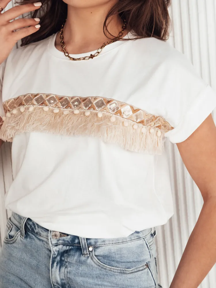 Ten T-shirt boho to idealna mieszanka casualowego komfortu i unikatowego stylu. Zaprojektowany z myślą o nowoczesnych kobietach, łączy on tradycyjne hafty z modnymi frędzlami, tworząc wygląd, który jest zarówno stylowy, jak i swobodny.