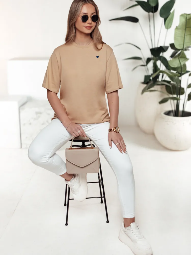 T-shirt MILOV to kwintesencja prostoty połączonej z eleganckim detalem. Luźny krój tego t-shirta jest odpowiedzią na potrzeby współczesnej kobiety, która ceni sobie komfort i swobodę, a małe haftowane serduszko dodaje subtelnej kobiecości. Ten t-shirt to uniwersalny wybór na każdą okazję – od casualowego wyjścia z przyjaciółmi po bardziej formalne spotkania.