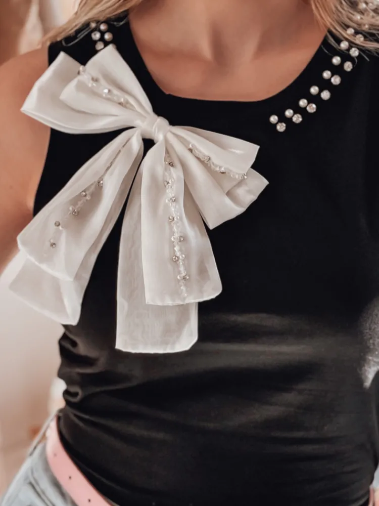Elegancki t-shirt na ramiączkach z efektowną, dużą kokardą, która dodaje szyku każdej stylizacji. Dekolt ozdobiony subtelnymi perełkami i błyszczącymi cyrkoniami, które nadają mu wyjątkowego charakteru. Wykonany z miękkiego i elastycznego materiału, idealnie dopasowuje się do sylwetki, zapewniając komfort noszenia na co dzień oraz w wyjątkowych okazjach.