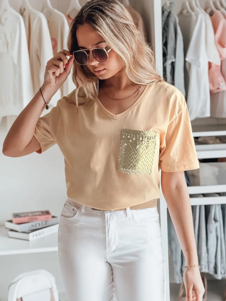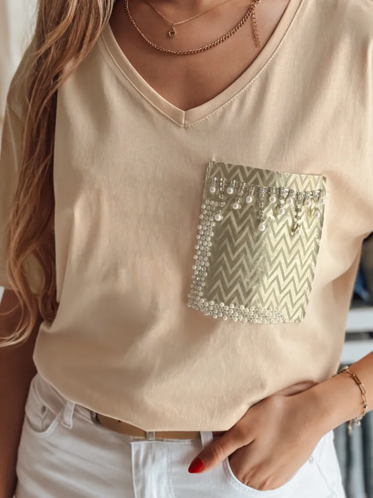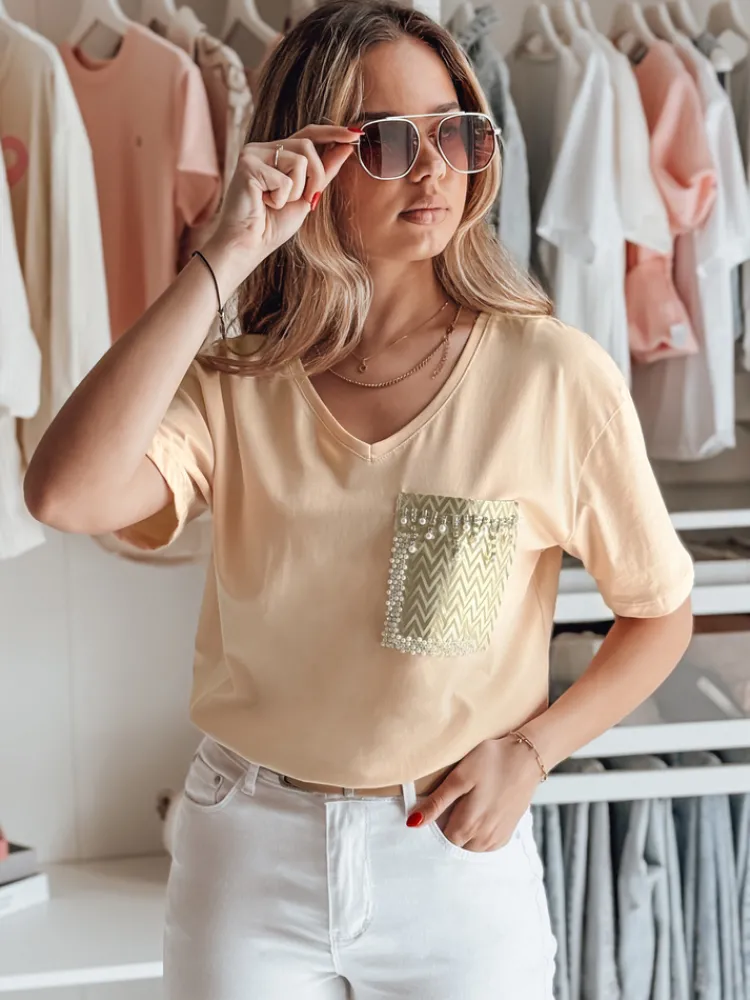 Prosty i uniwersalny T-shirt TASTI z dekoltem w serek to podstawowy element garderoby, który zyskuje wyjątkowy charakter dzięki ozdobionej koralikami kieszeni na piersi. Ta drobna, ale wyrazista cecha nadaje bluzce szyku i pozwala wyróżnić się z tłumu. Wybierz T-shirt TASTI, by dodać codziennym stylizacjom odrobinę elegancji.