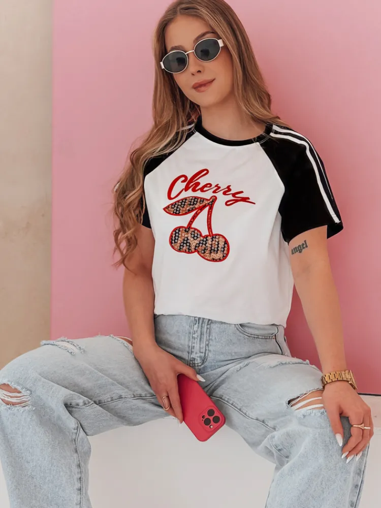 T-shirt damski z krótkim rękawem o sportowym charakterze, wyróżniający się nadrukiem wisienek z efektem 3D i błyszczącymi cekinami. Kontrastowe rękawy ozdobione podwójnymi paskami nadają mu dynamicznego stylu. Okrągły dekolt i luźniejszy krój zapewniają komfort oraz modny wygląd. Idealny do casualowych stylizacji w cieplejsze dni sezonu wiosennego.