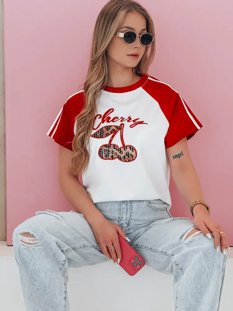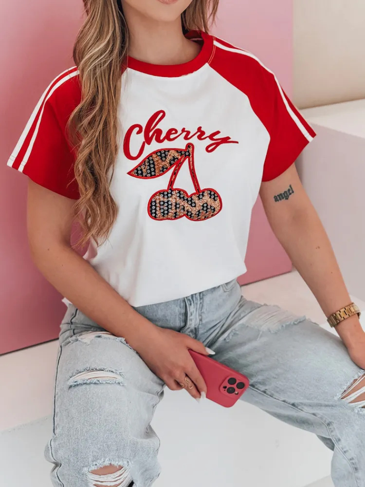 T-shirt damski z krótkim rękawem o sportowym charakterze, wyróżniający się nadrukiem wisienek z efektem 3D i błyszczącymi cekinami. Kontrastowe rękawy ozdobione podwójnymi paskami nadają mu dynamicznego stylu. Okrągły dekolt i luźniejszy krój zapewniają komfort oraz modny wygląd. Idealny do casualowych stylizacji w cieplejsze dni sezonu wiosennego.