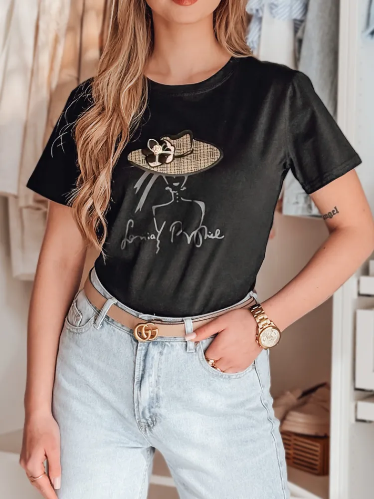 Stylowy t-shirt damski o swobodnym kroju z dekoracyjnym nadrukiem kobiety w kapeluszu. Naszyty kwiat na kapeluszu przyciąga wzrok i nadaje koszulce wyjątkowego wyrazu oraz efektu 3D. Klasyczny fason pasuje zarówno do codziennych stylizacji, jak i bardziej eleganckich zestawów.