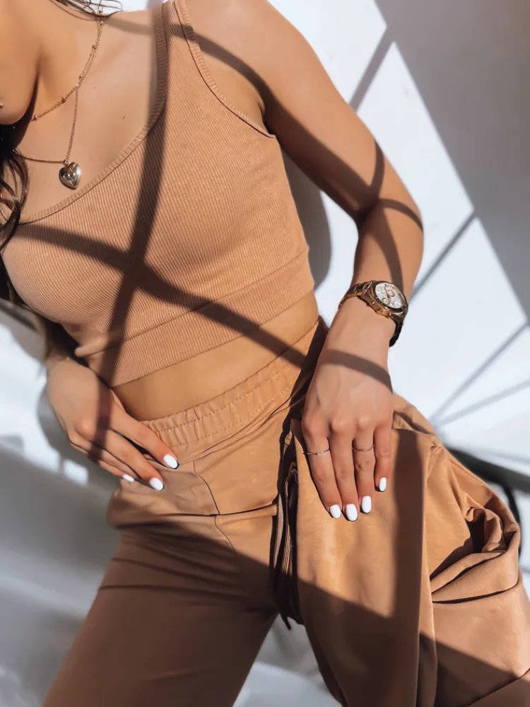 Prążkowany top to idealna propozycja do stylizacji. Model posiada szeroką gumkę pod biustem, dzięki czemu nie podchodzi do góry. Idealnie będzie pasował zarówno do dresów, jak i spodni jeansowych.