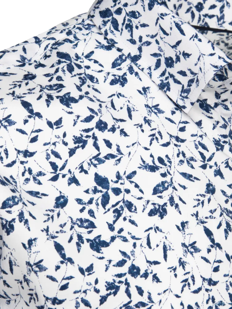 Męska koszula casualowa z długim rękawem wykonana z lekkiego materiału to doskonały wybór na wiosnę. Model wyróżnia się klasycznym kołnierzykiem oraz efektownym wzorem w stylizowane liście. Fason slim fit świetnie dopasowuje się do sylwetki, a mankiety z regulacją zapewniają komfort noszenia. Idealna do stylizacji smart casual.