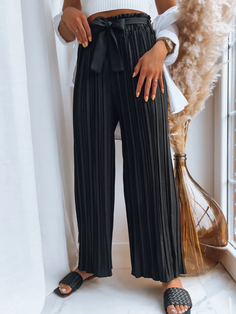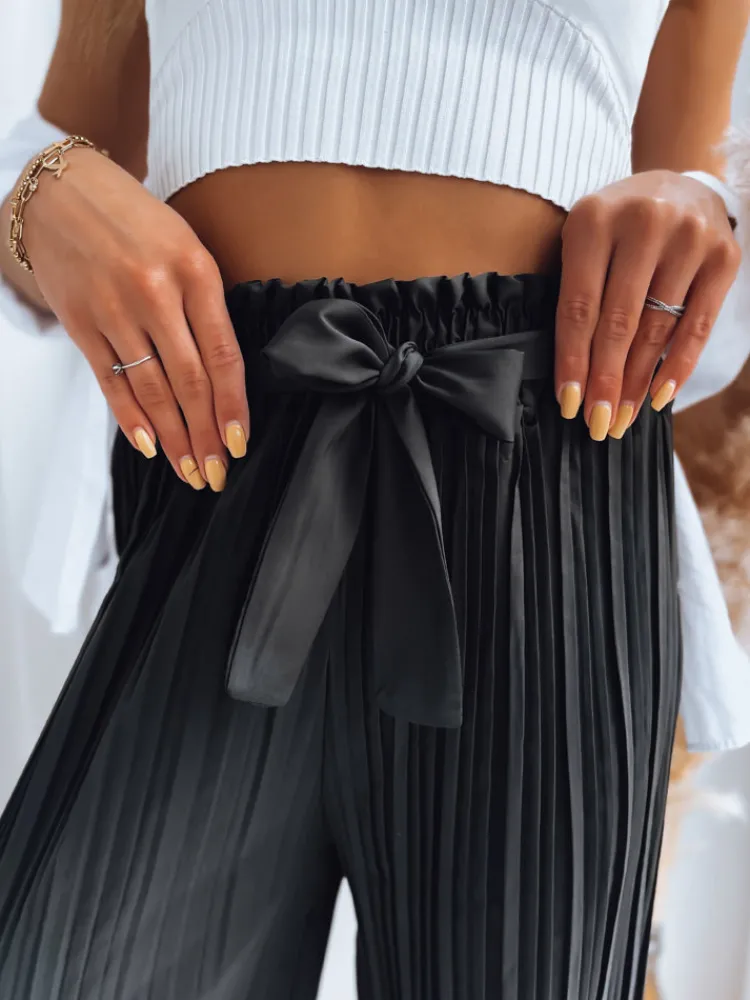 Spodnie z szeroką, prostą nogawką to niezbędnik tego sezonu. Niezwykle oryginalna propozycja. Spodnie posiadają celowo marszczoną nogawkę oraz efektownie wyglądające wiązanie w talii. Fason ten idealnie pasuje na każdy typ sylwetki. Dostępny w trzech wersjach kolorystycznych.