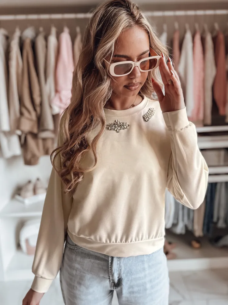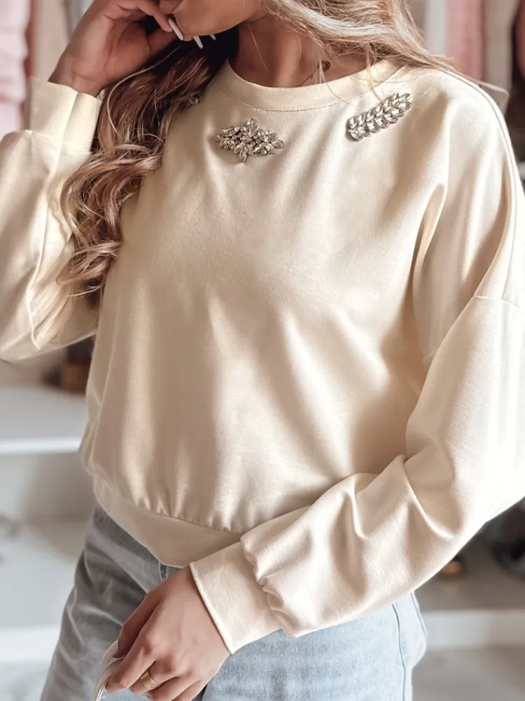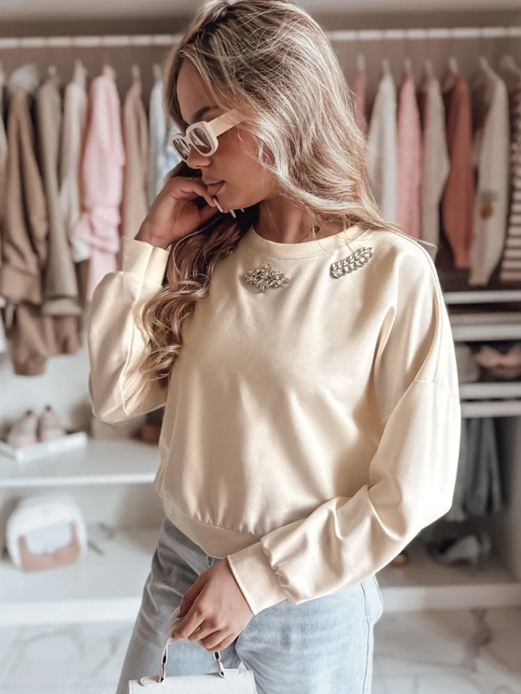 Nowoczesna bluzka z długim rękawem, która łączy wygodę z elegancją. Model o luźnym kroju, wykończony błyszczącymi cyrkoniami na dekolcie, dodaje subtelnego blasku każdej stylizacji. Krótsza długość sprawia, że doskonale pasuje do spodni z wysokim stanem. Ściągacze na dole i rękawach zapewniają świetne dopasowanie. Idealny wybór do wielu modnych oraz eleganckich stylizacji.