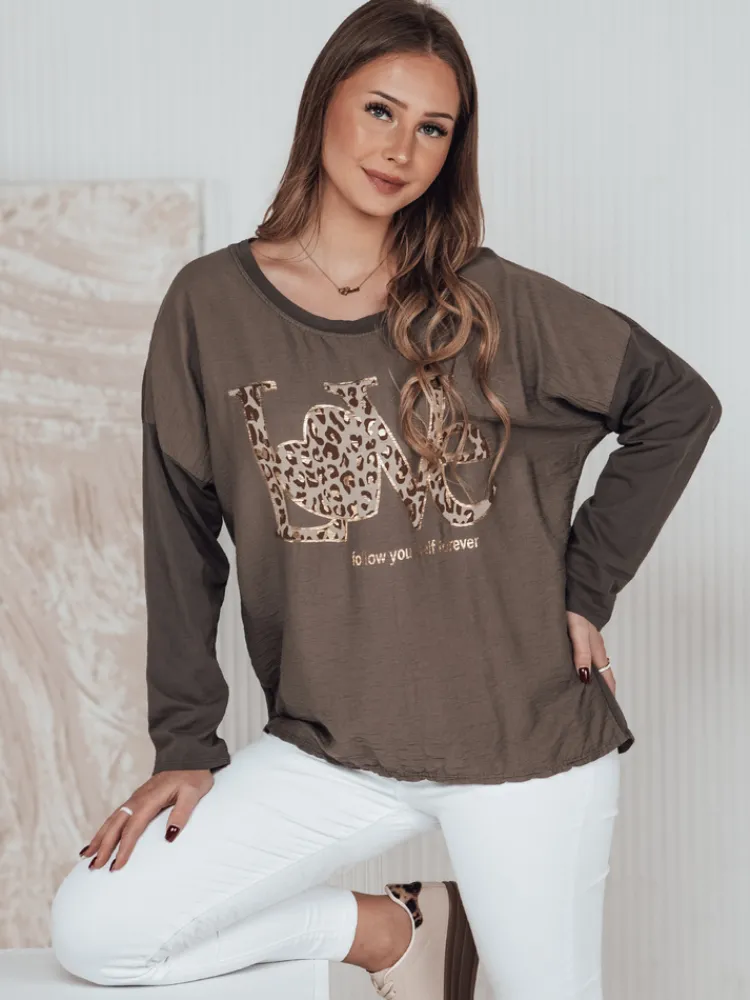 Bluzka z długim rękawem w luźnym fasonie, która zapewnia wygodę i styl na co dzień. Złoty napis „LOVE” z modnym panterkowym wzorem dodaje charakteru i elegancji. Idealna do jeansów lub legginsów, tworząc casualowe stylizacje na każdą okazję.