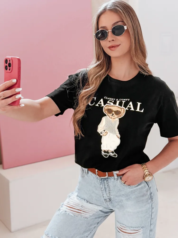 T-shirt damski z uroczą aplikacją misia i napisem „CLASSY & COMFY CASUAL to połączenie stylu i wygody. Wykonany z miękkiej tkaniny, doskonale sprawdzi się w codziennych stylizacjach. Luźny krój i zabawny detal przyciągają wzrok, czyniąc ten model świetnym wyborem na wiosenne dni.