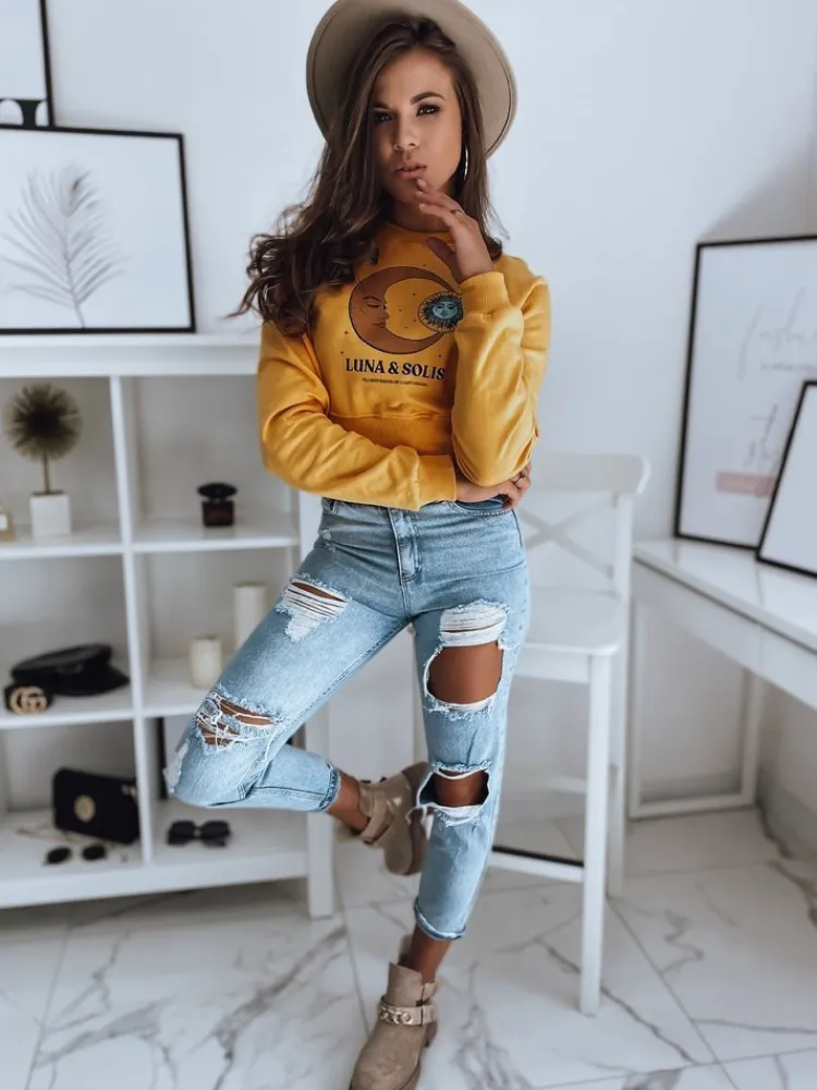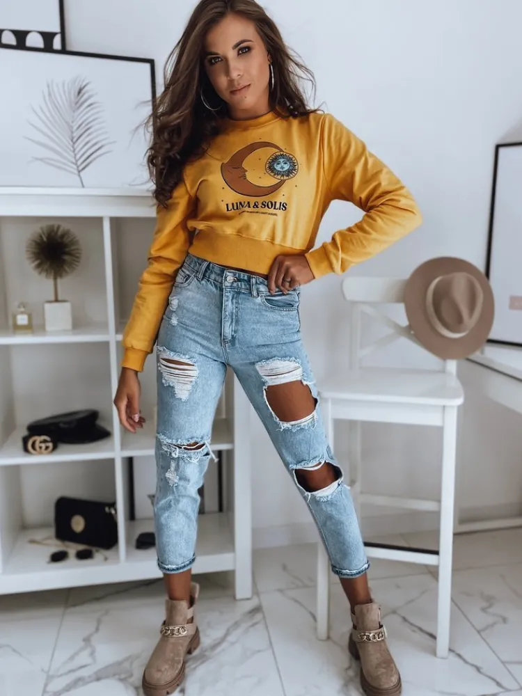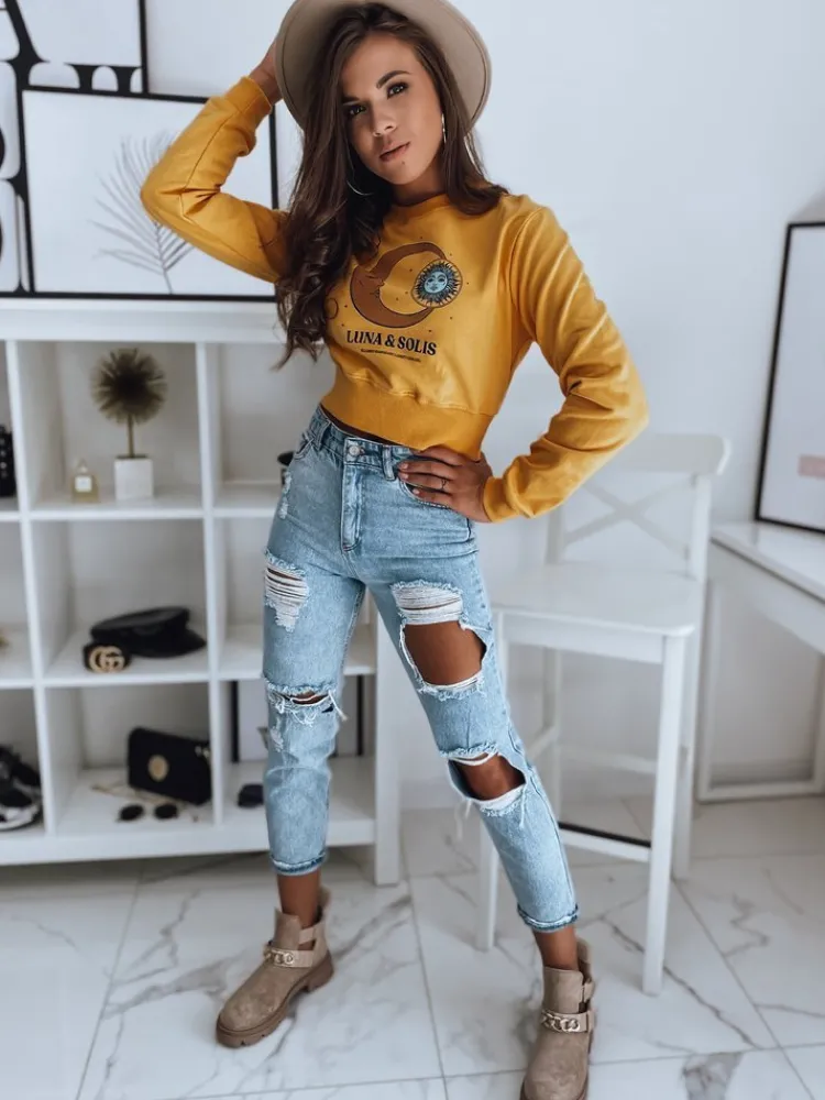 LUNA o nieco krótszym kroju została wykonana z wysokiej jakości materiału. Dzięki temu bluza gwarantuje pełną wygodę, co jest bardzo ważne na co dzień. Ten model jest uwielbiany przez kobiety. Posiada modny print oraz liczne ściągacze. Idealnie sprawdzają się, noszone na co dzień. W zestawieniu z odpowiednimi dodatkami można stworzyć ciekawe stylizacje.