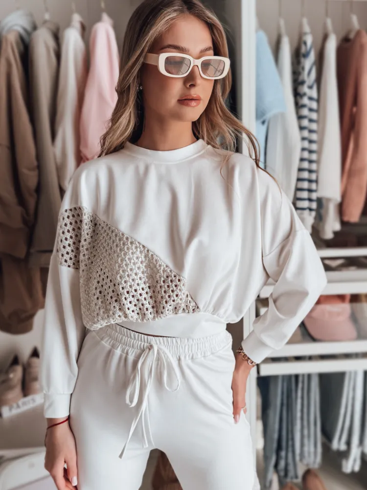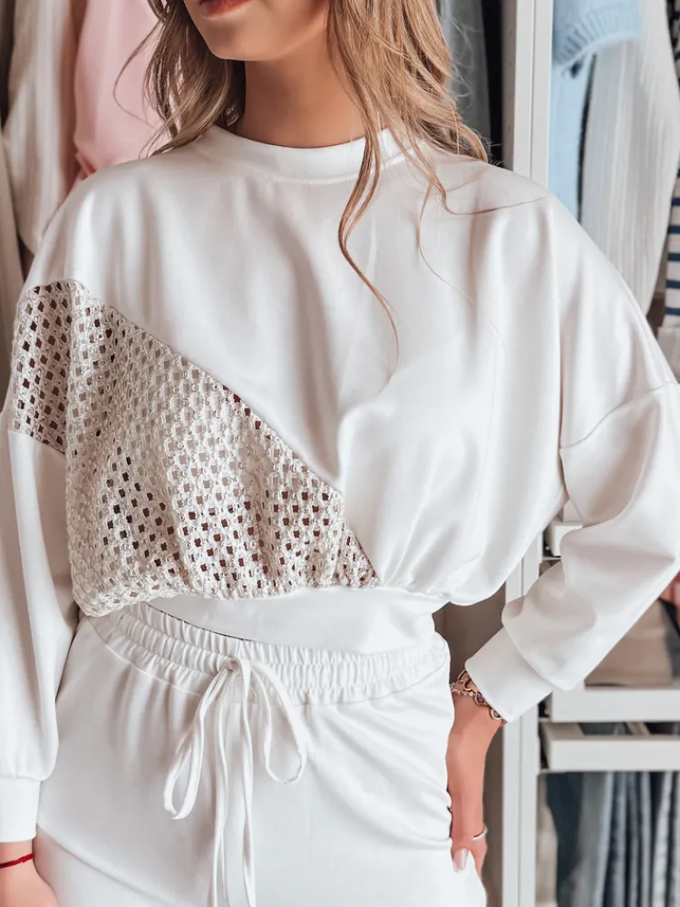 Minimalistyczna bluza z nowoczesnym akcentem – ozdobna wstawka z ażurowej tkaniny przyciąga uwagę i dodaje całości lekkości. Wygodny fason zapewnia swobodę ruchów, dzięki czemu model ten sprawdzi się zarówno na co dzień, jak i w bardziej eleganckich zestawieniach.