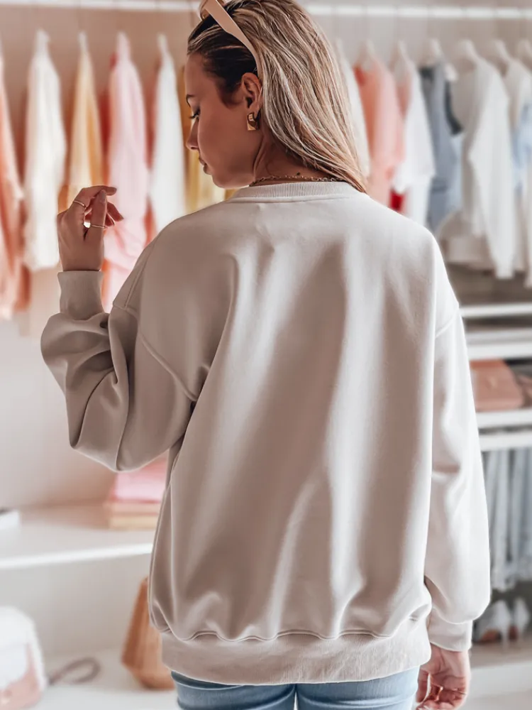 Bluza damska oversize z okrągłym dekoltem i ozdobnym haftem przedstawiającym jamnika w zimowej stylizacji. Model one size, z elastycznymi ściągaczami przy mankietach i na dole. Uniwersalny rozmiar pasuje od XS do L. Haft nadaje trójwymiarowy efekt, a przyjemny w dotyku materiał premium zapewnia komfort oraz dobrze układa się na sylwetce. Sprawdzi się na chłodniejsze wiosenne dni.