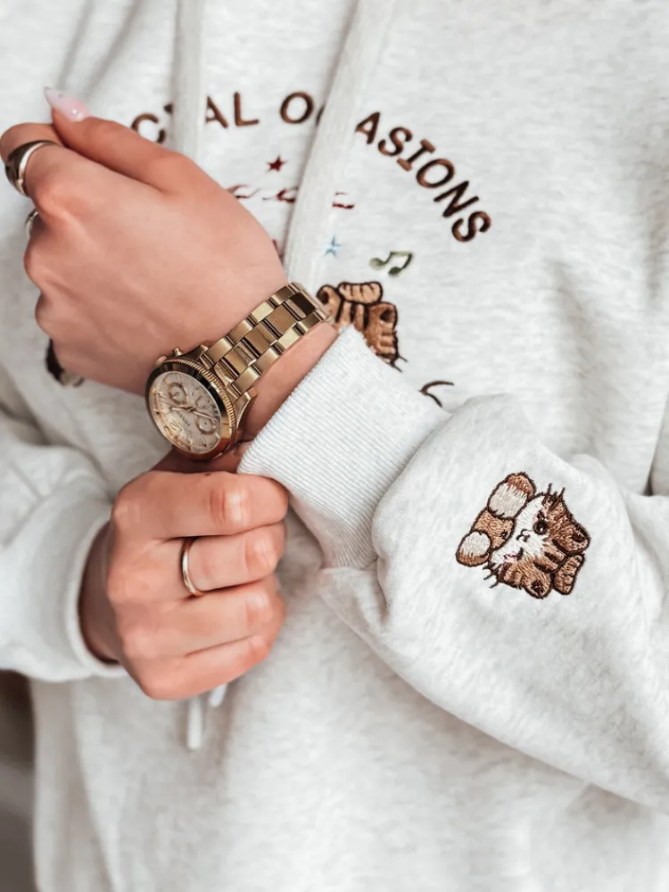 Bluza damska oversize z kapturem to połączenie wygody i stylu, które doskonale wpisuje się w wiosenne stylizacje. Uniwersalny rozmiar pasuje od XS do L. Uwagę przyciąga efektowny haft z uroczymi kotkami oraz napisem „SPECIAL OCASIONS”, który dodaje całości dziewczęcego uroku. Haft pojawia się również na rękawie, co tworzy spójny detal. Kaptur regulowany sznurkiem, ściągacze przy rękawach i na dole bluzy podkreślają jej casualowy charakter. Świetnie sprawdzi się w codziennym wydaniu.