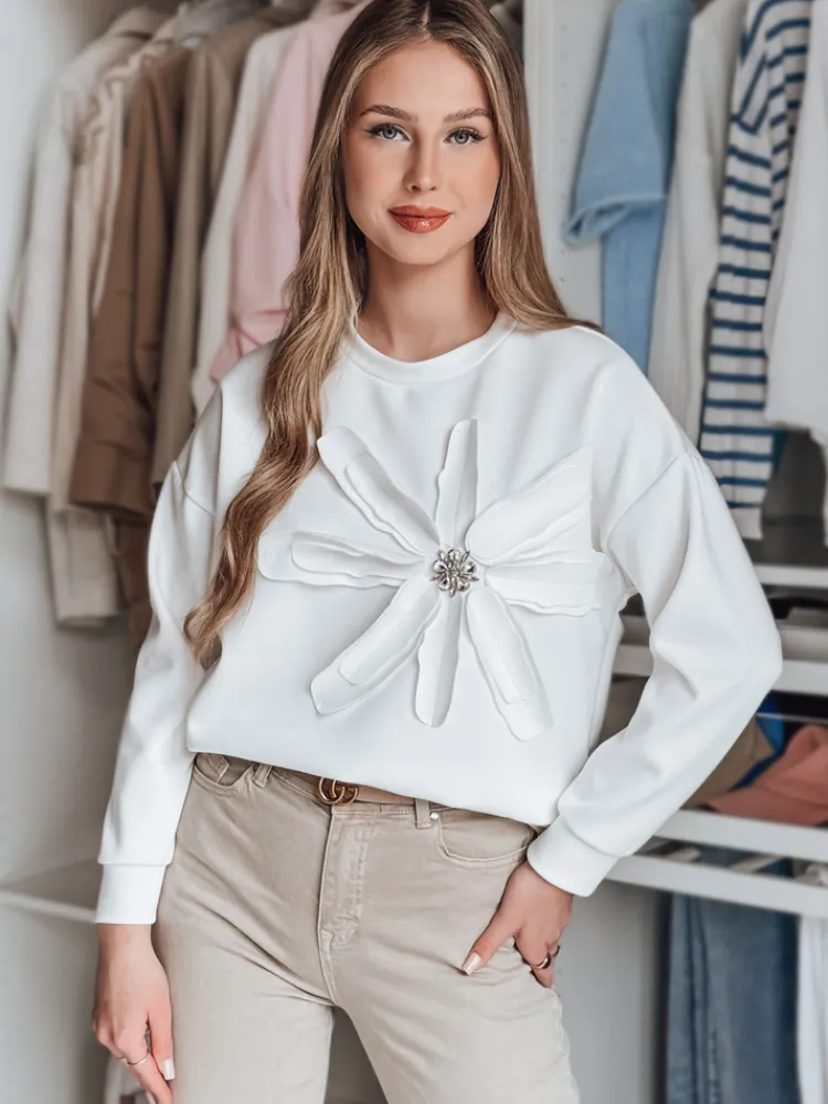 Bluza damska w kroju oversize, wyróżniająca się przestrzenną aplikacją w kształcie kwiatu z połyskującymi cyrkoniami. Uniwersalny rozmiar pasuje od XS do L. Minimalistyczny design łączy się z efektownymi detalami, tworząc nietuzinkowy element garderoby. Świetna do jeansów i spodni materiałowych.