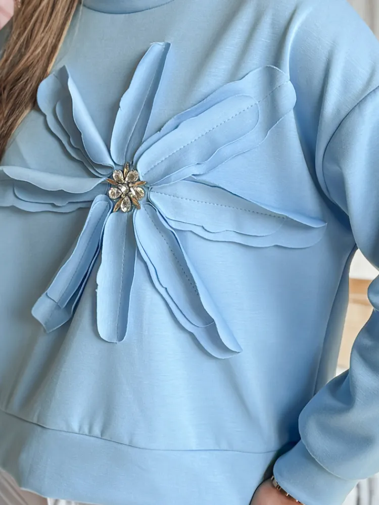 Bluza damska w kroju oversize, wyróżniająca się przestrzenną aplikacją w kształcie kwiatu z połyskującymi cyrkoniami. Uniwersalny rozmiar pasuje od XS do L. Minimalistyczny design łączy się z efektownymi detalami, tworząc nietuzinkowy element garderoby. Świetna do jeansów i spodni materiałowych.
