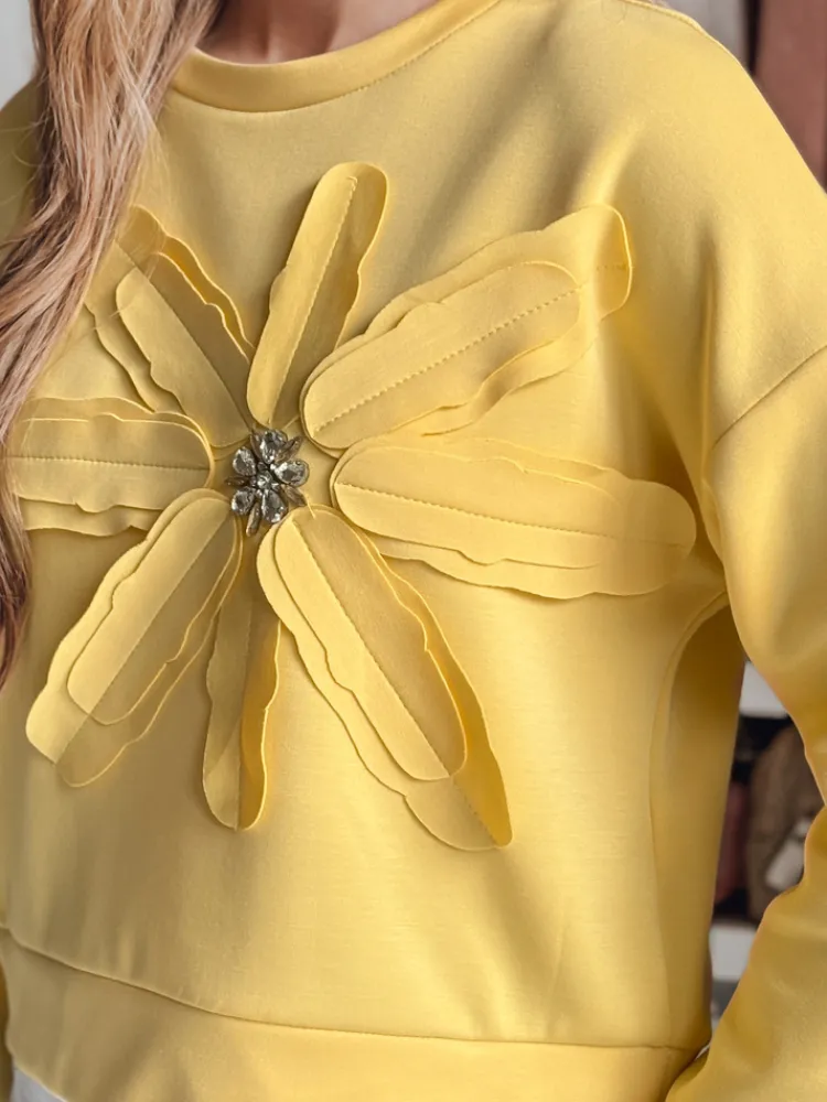 Bluza damska w kroju oversize, wyróżniająca się przestrzenną aplikacją w kształcie kwiatu z połyskującymi cyrkoniami. Uniwersalny rozmiar pasuje od XS do L. Minimalistyczny design łączy się z efektownymi detalami, tworząc nietuzinkowy element garderoby. Świetna do jeansów i spodni materiałowych.
