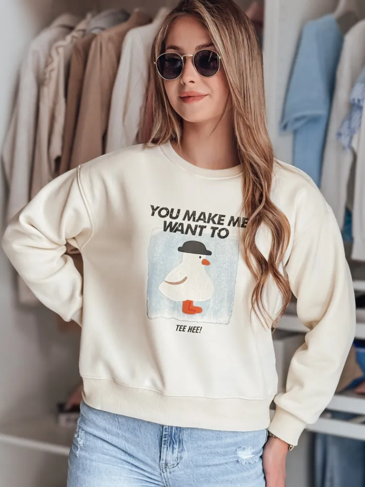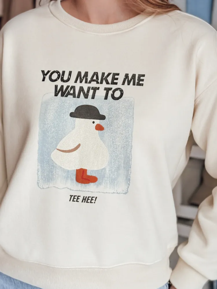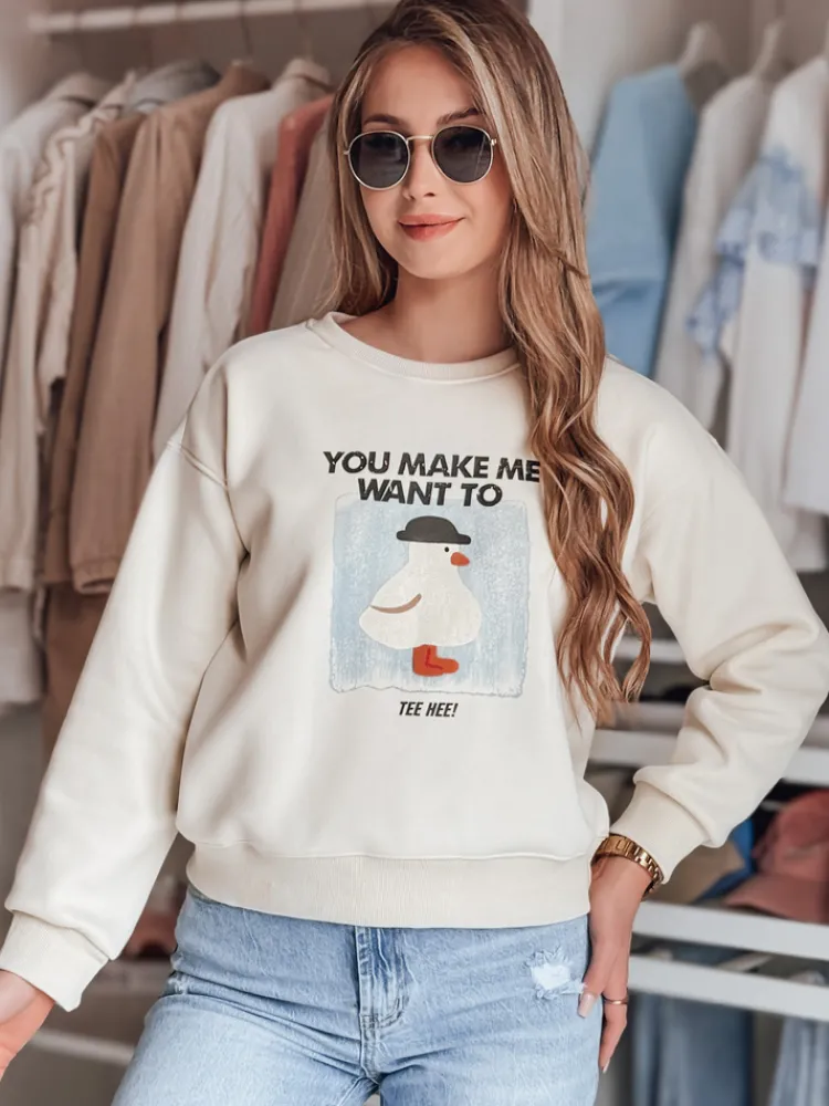 Bluza damska oversize o krótkim fasonie to propozycja dla miłośniczek stylu casual. Wygodny krój i miękki, przyjemny w dotyku materiał premium zapewniają komfort noszenia na co dzień. Model zdobi nadruk z zabawną grafiką oraz napisem, który dodaje całości uroku. Uniwersalny rozmiar pasuje od XS do L. Ściągacze na dole i przy rękawach podkreślają luźny, ale estetyczny fason. Bluza idealnie wpisuje się w aktualnie trendy.