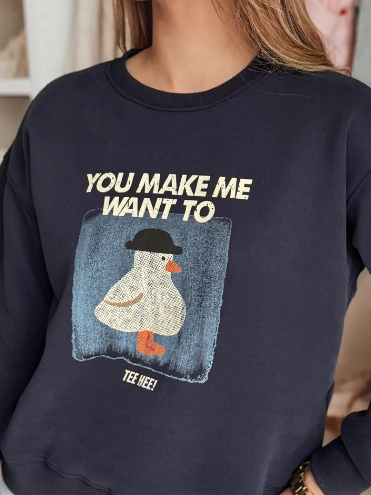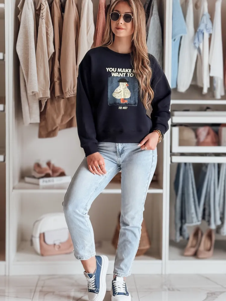 Bluza damska oversize o krótkim fasonie to propozycja dla miłośniczek stylu casual. Wygodny krój i miękki, przyjemny w dotyku materiał premium zapewniają komfort noszenia na co dzień. Model zdobi nadruk z zabawną grafiką oraz napisem, który dodaje całości uroku. Uniwersalny rozmiar pasuje od XS do L. Ściągacze na dole i przy rękawach podkreślają luźny, ale estetyczny fason. Bluza idealnie wpisuje się w aktualnie trendy.