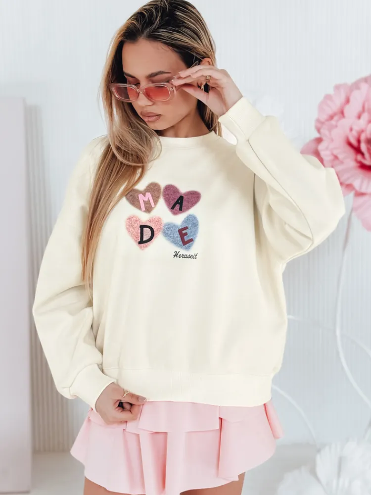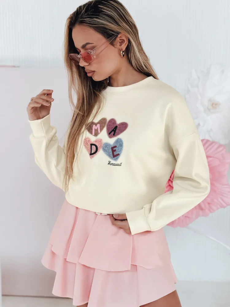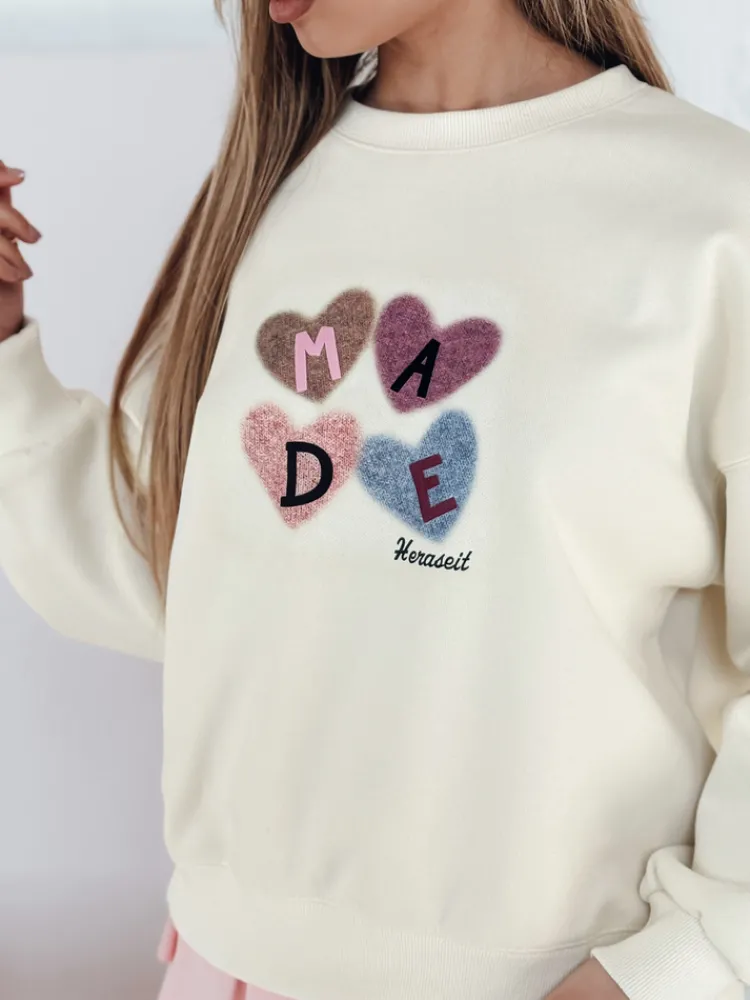 Bluza damska oversize o luźnym kroju, który gwarantuje wygodę na co dzień. Wykonana z miękkiego materiału premium, który delikatnie otula skórę. Na przodzie uroczy nadruk w kształcie serc z literami oraz subtelny napis „Heraseit”. Uniwersalny rozmiar pasuje od XS do L. Ściągacze przy rękawach i na dole zapewniają komfort noszenia i idealne dopasowanie. Bluza idalna na okres przejściowy do casualowych zestawów.