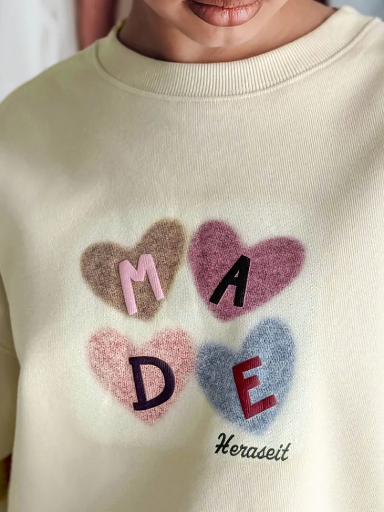 Bluza damska oversize o luźnym kroju, który gwarantuje wygodę na co dzień. Wykonana z miękkiego materiału premium, który delikatnie otula skórę. Na przodzie uroczy nadruk w kształcie serc z literami oraz subtelny napis „Heraseit”. Uniwersalny rozmiar pasuje od XS do L. Ściągacze przy rękawach i na dole zapewniają komfort noszenia i idealne dopasowanie. Bluza idalna na okres przejściowy do casualowych zestawów.