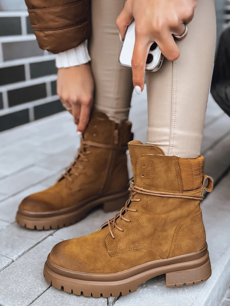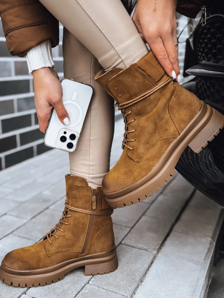 Wykonane z wysokiej jakości imitacji zamszu, sznurowane botki to niezbędnik, jeśli chodzi o tworzenie jesienno-zimowych stylizacji. Umiejscowione zostały na grubej podeszwie. Po zewnętrznej stronie buta znajduje się również zamek. Idealnie zaprezentuje się zarówno ze spodniami, jak i sukienką. Model dostępny w czterech kolorach.
