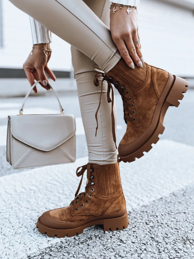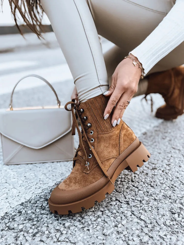Sznurowane botki z imitacji zamszu to idealna propozycja na ten sezon! Umiejscowione zostały na grubej podeszwie. Model nie jest ocieplany. Doskonale sprawdzi się do jesienno-zimowych stylizacji.