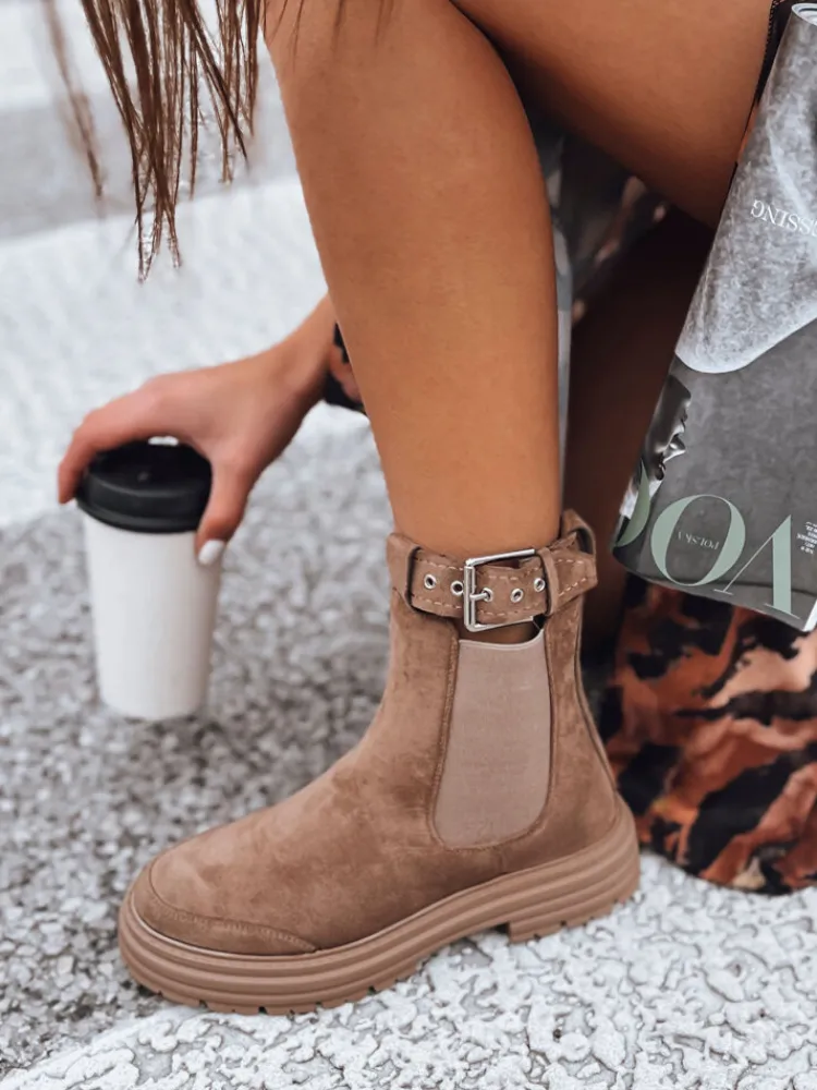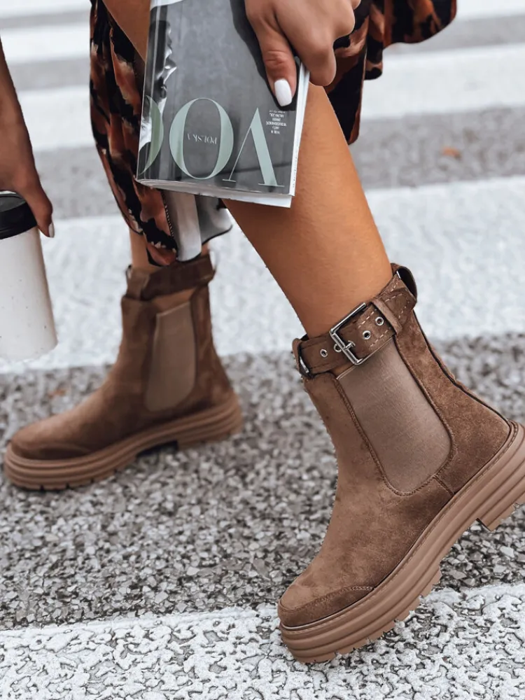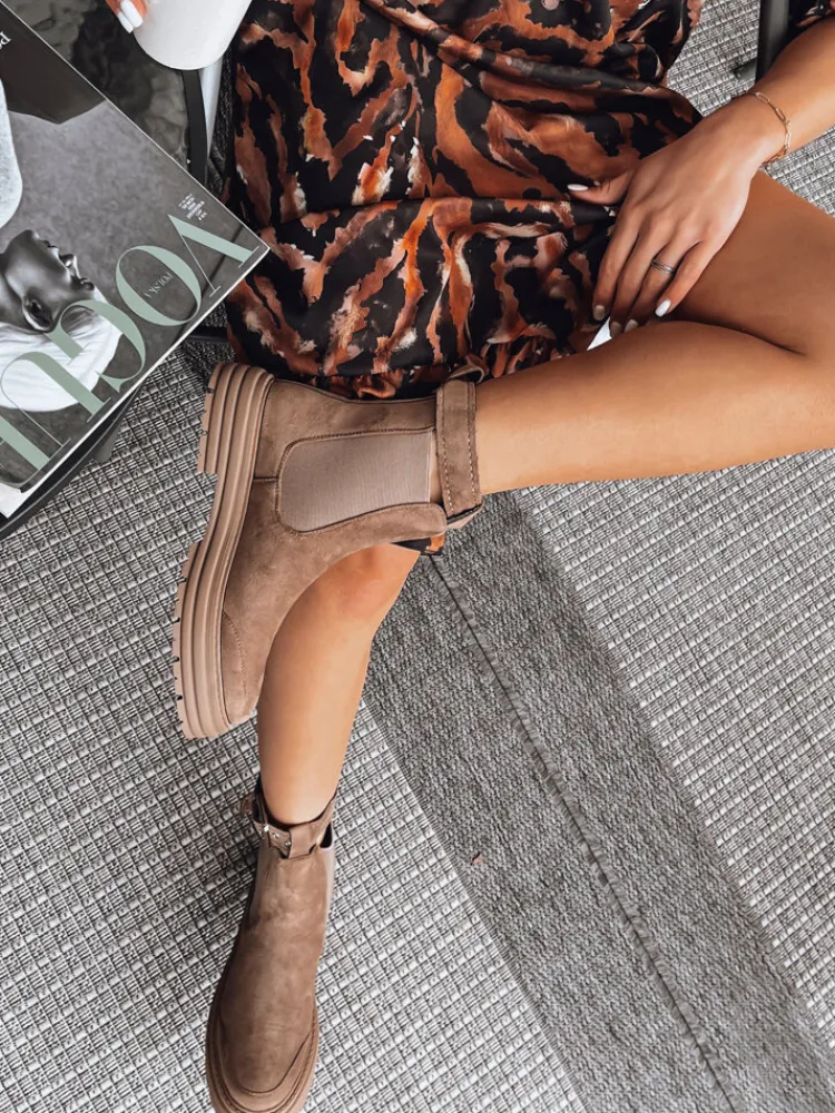 Botki z imitacji zamszu to dopełnienie stylizacji. Model posiada ozdobną klamrę. Botki na grubej podeszwie to HIT tego sezonu. Pięknie zaprezentują się zarówno z sukienką, jak i spodniami. Standardowa rozmiarówka, zalecamy wybór swojego rozmiaru.
