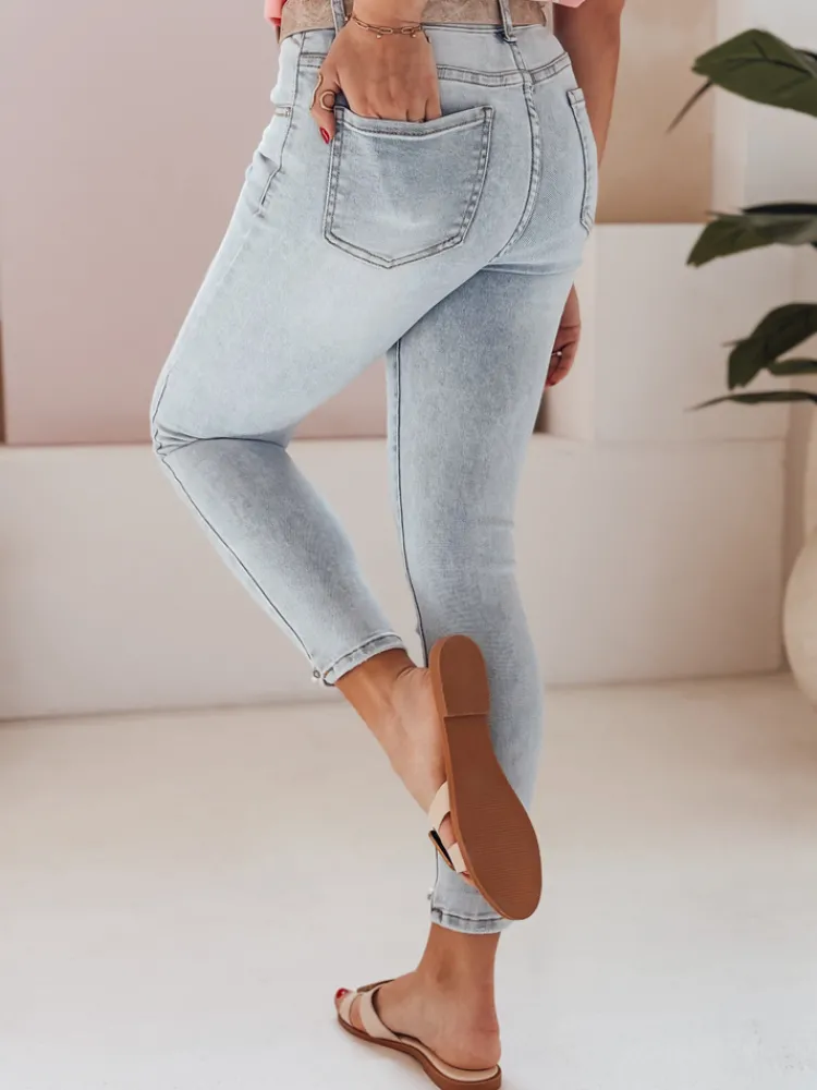 Jeansy damskie slim fit z wysokim stanem i dekoracyjnym wykończeniem perełkami to modna baza do wiosennych stylizacji. Dopasowany fason z dodatkiem spandexu wysmukla nogi, a połyskujące detale przyciągają spojrzenia. Idealne do casualowych looków z t-shirtem i sandałkami.