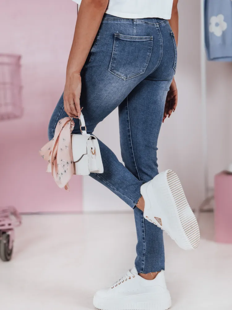Dopasowane jeansy skinny o klasycznym kroju idealne do codziennych stylizacji. Unikalny design w górnej części spodni oraz wysoki stan sprawiają, że nogi wydają się optycznie dłuższe i zgrabniejsze. Uniwersalny wybór na wiele okazji.