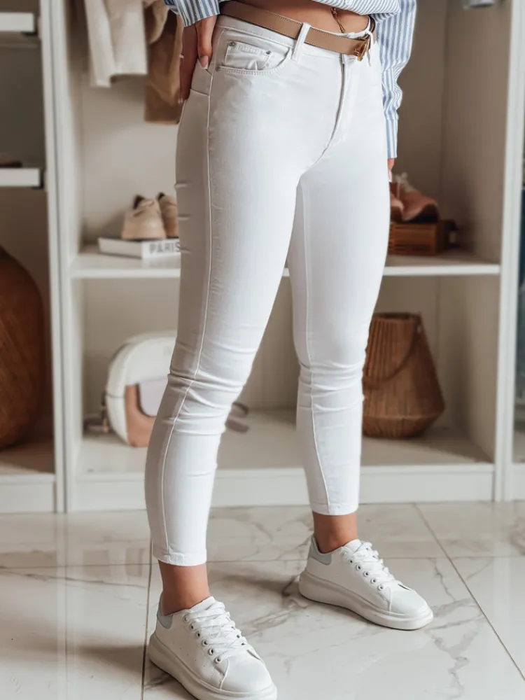 Damskie jeansy skinny z niskim stanem to doskonała propozycja dla miłośniczek dopasowanych fasonów. Ozdobne kieszenie i zapięcie na guzik z zamkiem gwarantują wygodę, a długość 7/8 subtelnie podkreśla kostki oraz optycznie wyszczupla nogi. Idealne do casualowych i eleganckich stylizacji, świetnie komponują się zarówno ze sneakersami, jak i szpilkami.