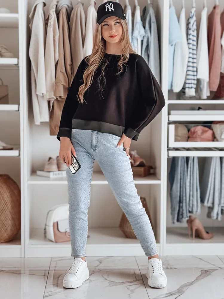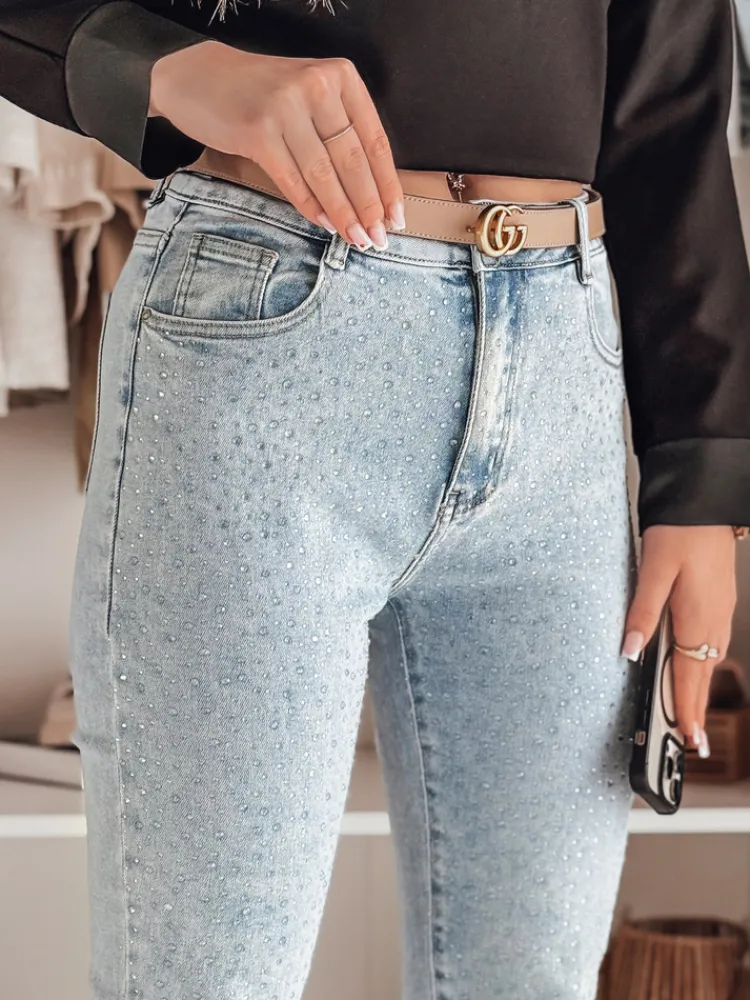 Jeansy slim fit z wysokim stanem, które podkreślają sylwetkę i optycznie wysmuklają nogi. Klasyczne ozdobne kieszenie i zapięcie na guzik oraz zamek dodają funkcjonalności, a całość urozmaicają subtelne, przeźroczyste diamenciki. Efektowny design świetnie komponuje się zarówno z eleganckimi, jak i casualowymi stylizacjami.