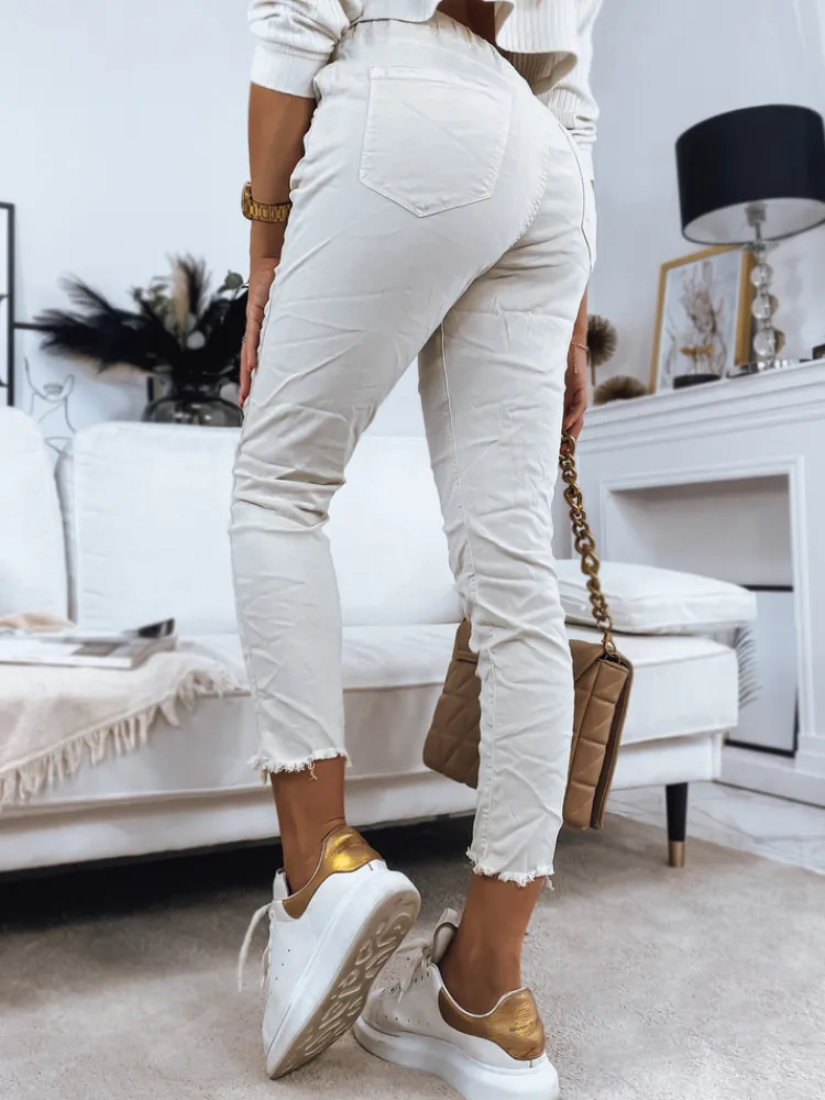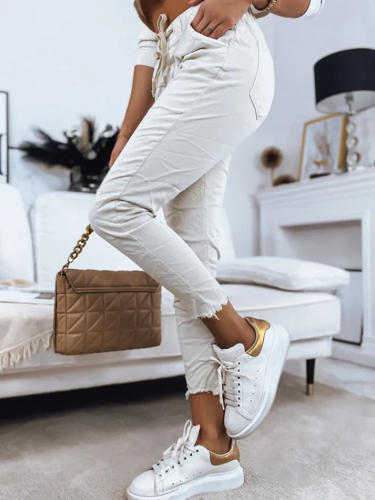 Spodnie MIKI szczególnie polecane są dla osób, które cenią wygodę. Dostępne aż w 9 kolorach. Rozciągliwy materiał sprawia, że spodnie idealnie dopasowują się do ciała. Model posiada gumkę wraz ze sznureczkiem w pasie, co czyni go bardzo komfortowym. Dół spodni jest lekko poszarpany, co doda charakteru stylizacjom.