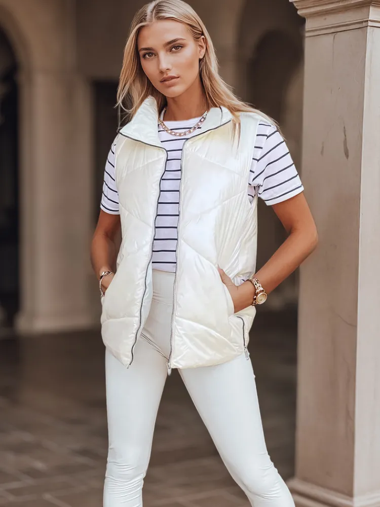 Kamizelka wykonana ze śliskiego materiału sprawi, że zawsze wyróżnisz się z tłumu. Zapinana jest na zamek. Posiada ozdobne zamki na dole po obu stronach. Jasne kolory pięknie mienią się w świetle! Model posiada stójkę. Zdecydowanie jest to MUST HAVE nadchodzącego sezonu. Będzie idealna na sezon jesienno-zimowy, ponieważ jest ocieplana.