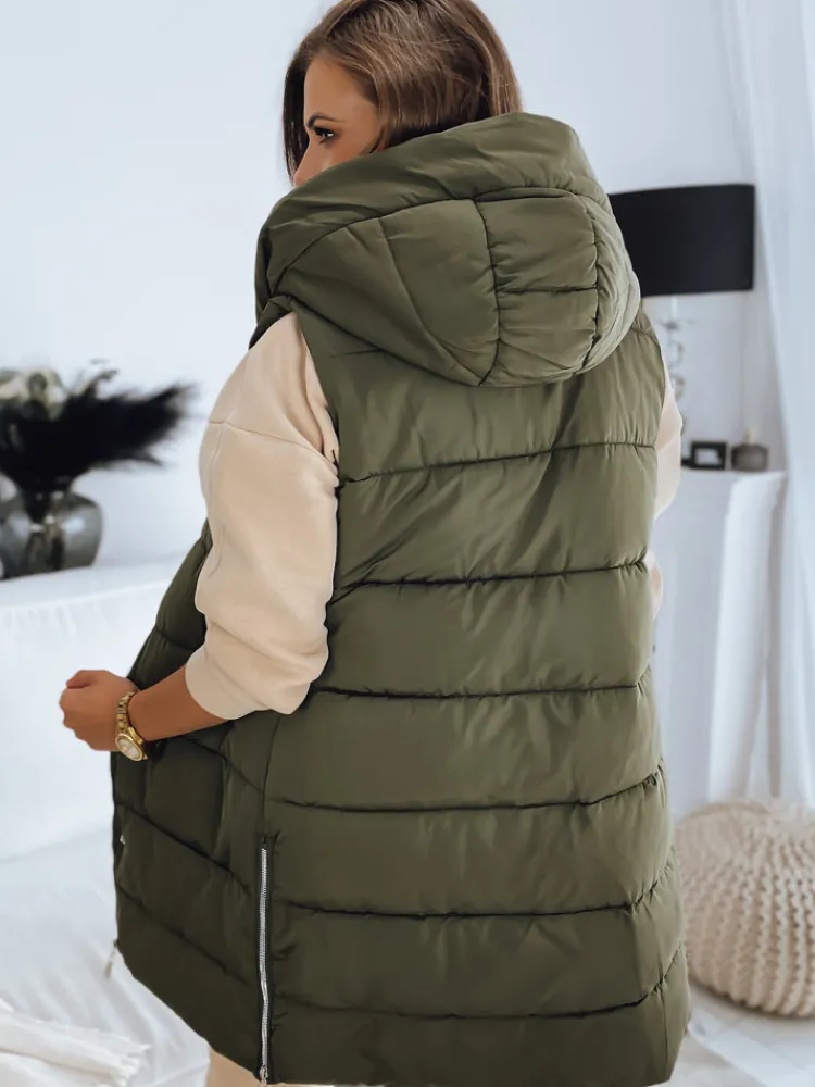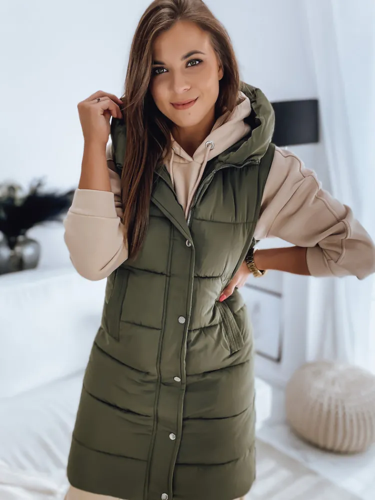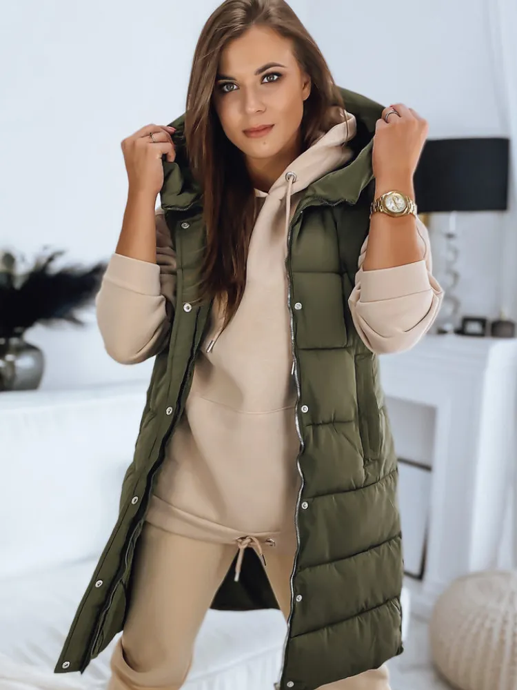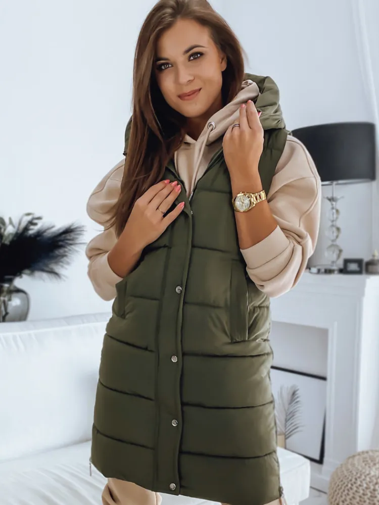 Pikowana, długa kamizelka to idealna propozycja na chłodne dni. Model NOELIA posiada zamki po bokach oraz dwie pojemne kieszenie na przodzie. Kaptur nie jest odpinany. Kamizelka zapinana jest na suwak i napy, dzięki czemu maksymalnie chroni przed chłodem.