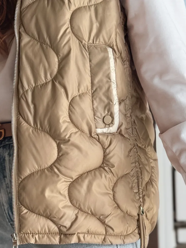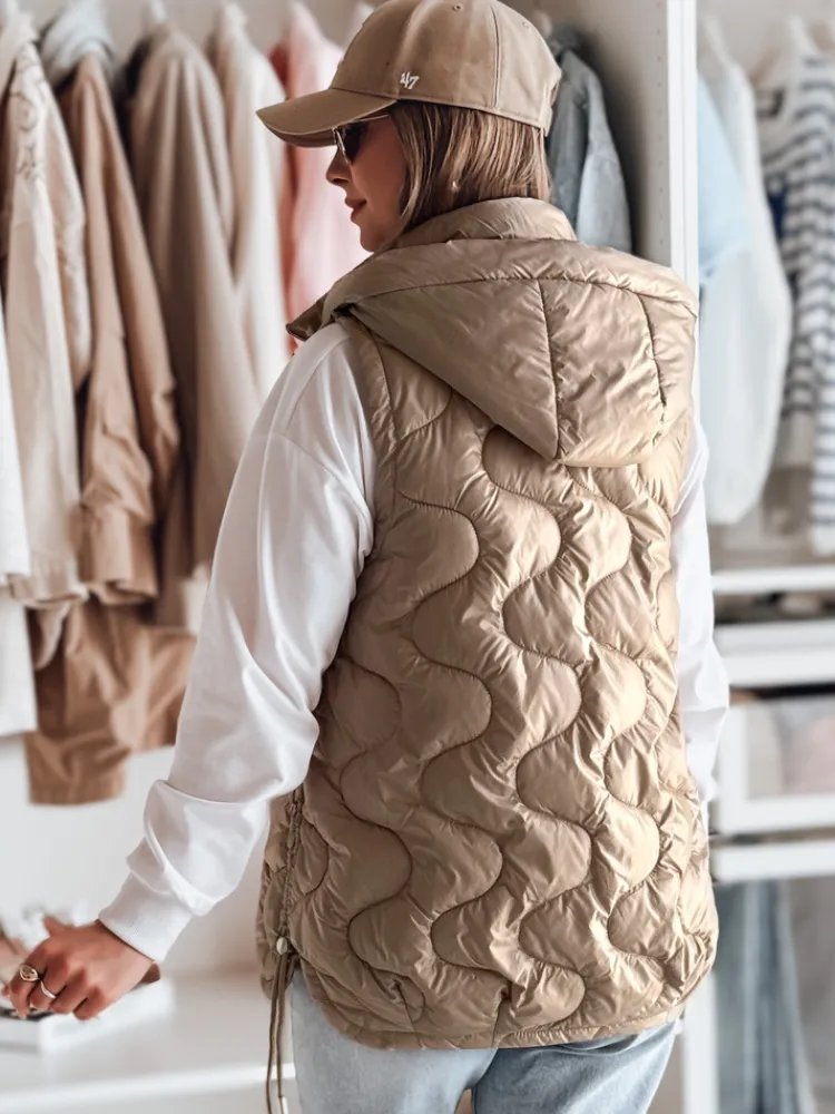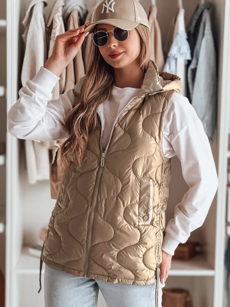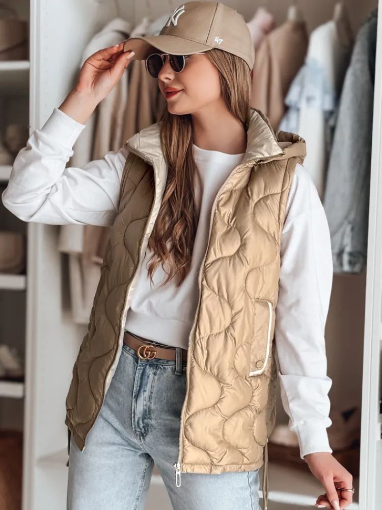 Stylowa kamizelka przejściowa z unikalnym pikowaniem, które dodaje charakteru. Wypełnienie zapewnia lekki komfort cieplny, a regulowane boki pozwalają na indywidualne dopasowanie. Model z odpinanym kapturem oraz ozdobnymi kieszeniami na drobiazgi. Idealna do warstwowych stylizacji w sezonie przejściowym.