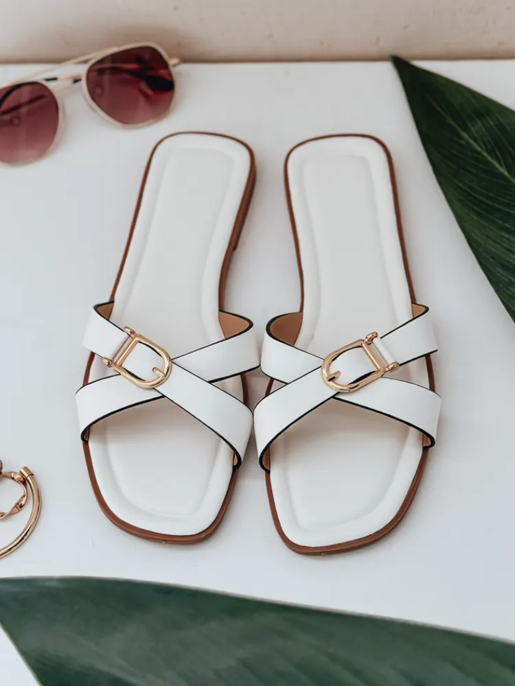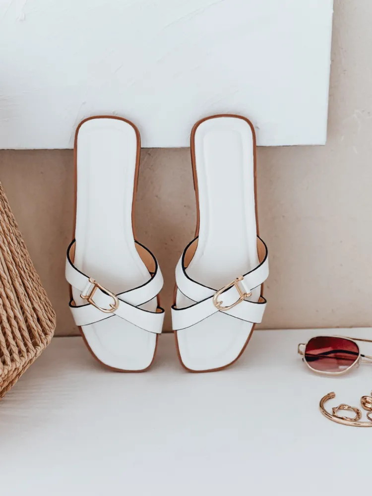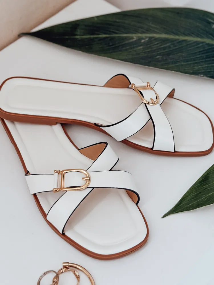 Klapki damskie wykonane z wysokiej jakości skóry ekologicznej, z dekoracyjną klamrą i krzyżującymi się paskami. Stylowy design i uniwersalny charakter sprawiają, że idealnie komponują się zarówno z sukienką, jak i jeansami. Lekkie, wygodne i modne – świetne na wiosenne dni.