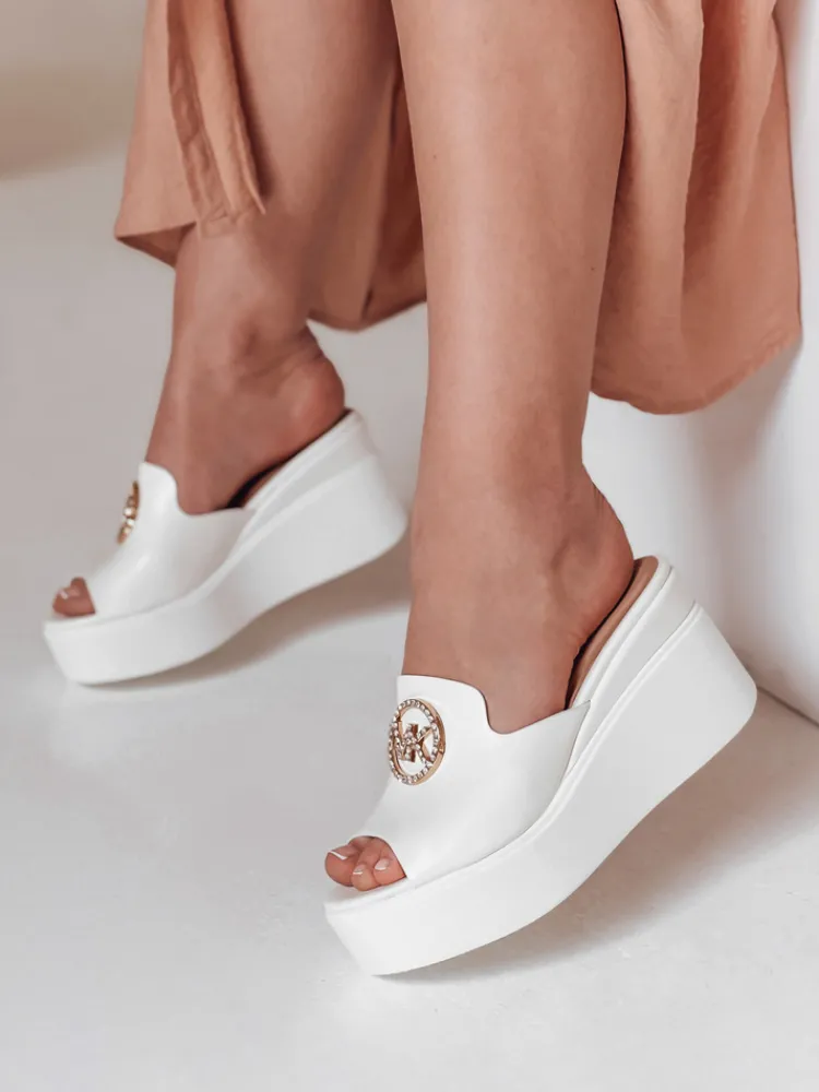Stylowe klapki damskie z ekoskóry to must-have na wiosnę. Obcas w formie klina 8 cm i 3,5-centymetrowa podeszwa gwarantują komfort oraz stabilność. Uwagę przyciąga błyszcząca ozdoba z cyrkoniami na przodzie, która dodaje butom wyjątkowego charakteru. Idealne do sukienek i codziennych stylizacji.