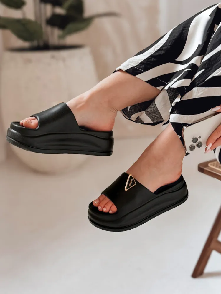Damskie klapki na masywnej, 5,5-centymetrowej podeszwie to połączenie wygody i miejskiego stylu. Zostały wykonane z lekkiego, elastycznego tworzywa, które dopasowuje się do stopy, zapewniając komfort przez cały dzień. Trójkątna naszywka z przodu nadaje im modowy charakter. Idealne na lato – zarówno na spacer, jak i na wakacyjne stylizacje.