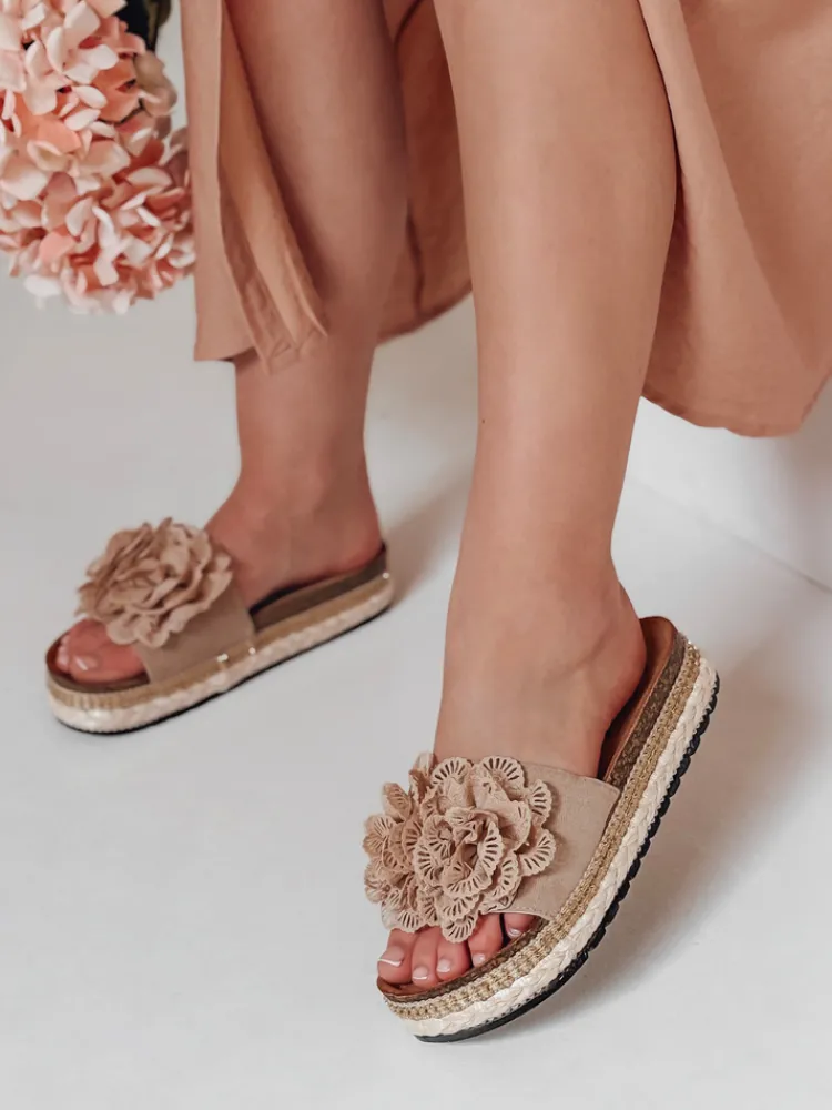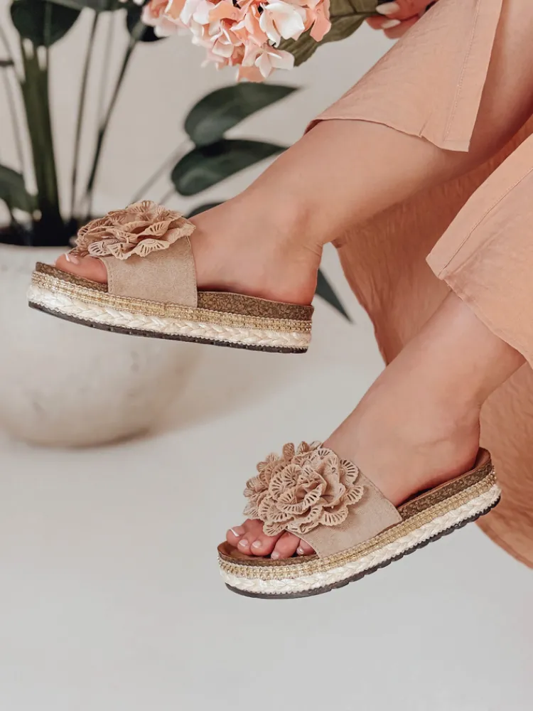Stylowe klapki na grubszej podeszwie wyróżniają się efektowną aplikacją kwiatową. Cholewka z ekoskóry i zamszowa wkładka tworzą zgrany duet – modny wygląd i wygoda na co dzień. Te buty to świetna opcja na sezon wiosenny lub letni, kiedy liczy się lekkość, kobiecość i oryginalność.