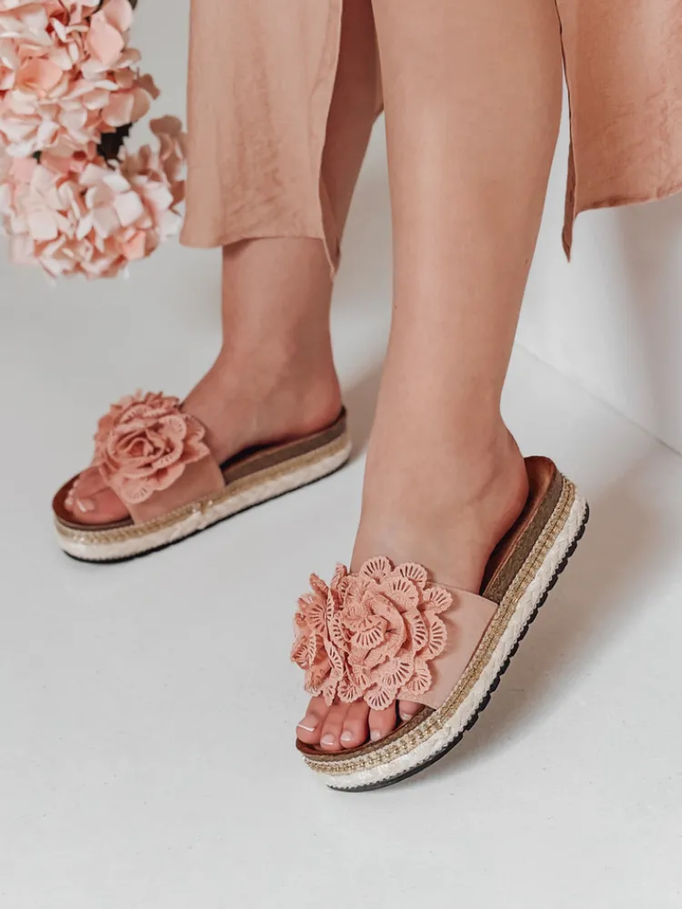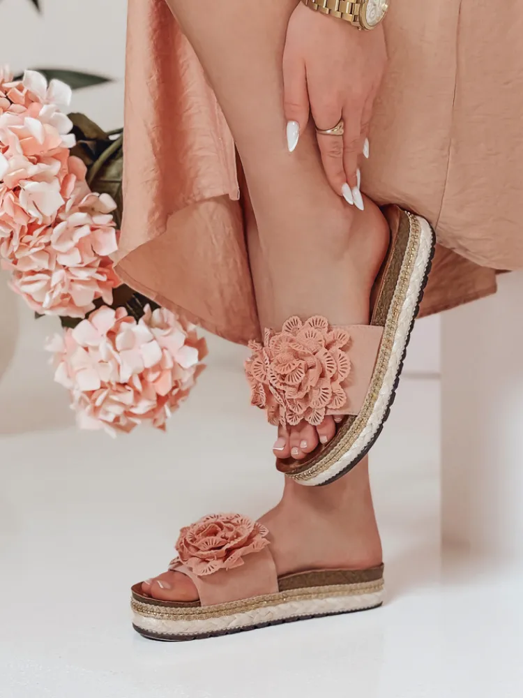 Stylowe klapki na grubszej podeszwie wyróżniają się efektowną aplikacją kwiatową. Cholewka z ekoskóry i zamszowa wkładka tworzą zgrany duet – modny wygląd i wygoda na co dzień. Te buty to świetna opcja na sezon wiosenny lub letni, kiedy liczy się lekkość, kobiecość i oryginalność.