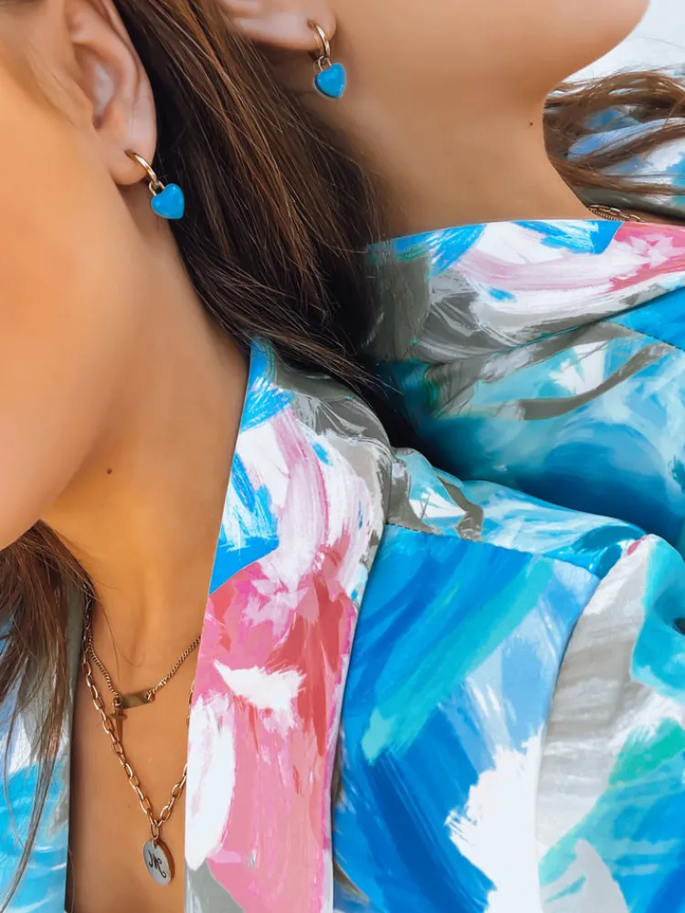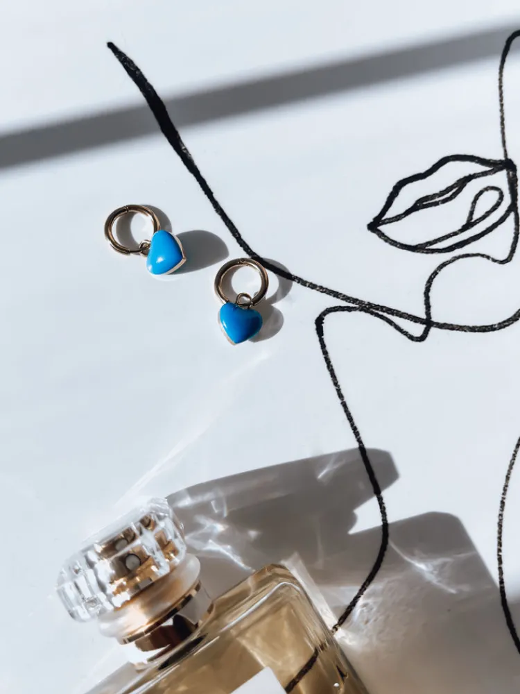 Kolczyki w złotym kolorze typu ring, to niezwykle stylowa propozycja, która dopełni stylizacje zarówno codzienne jak i eleganckie. Całość urozmaica niebieska zawieszka w kształcie serca.